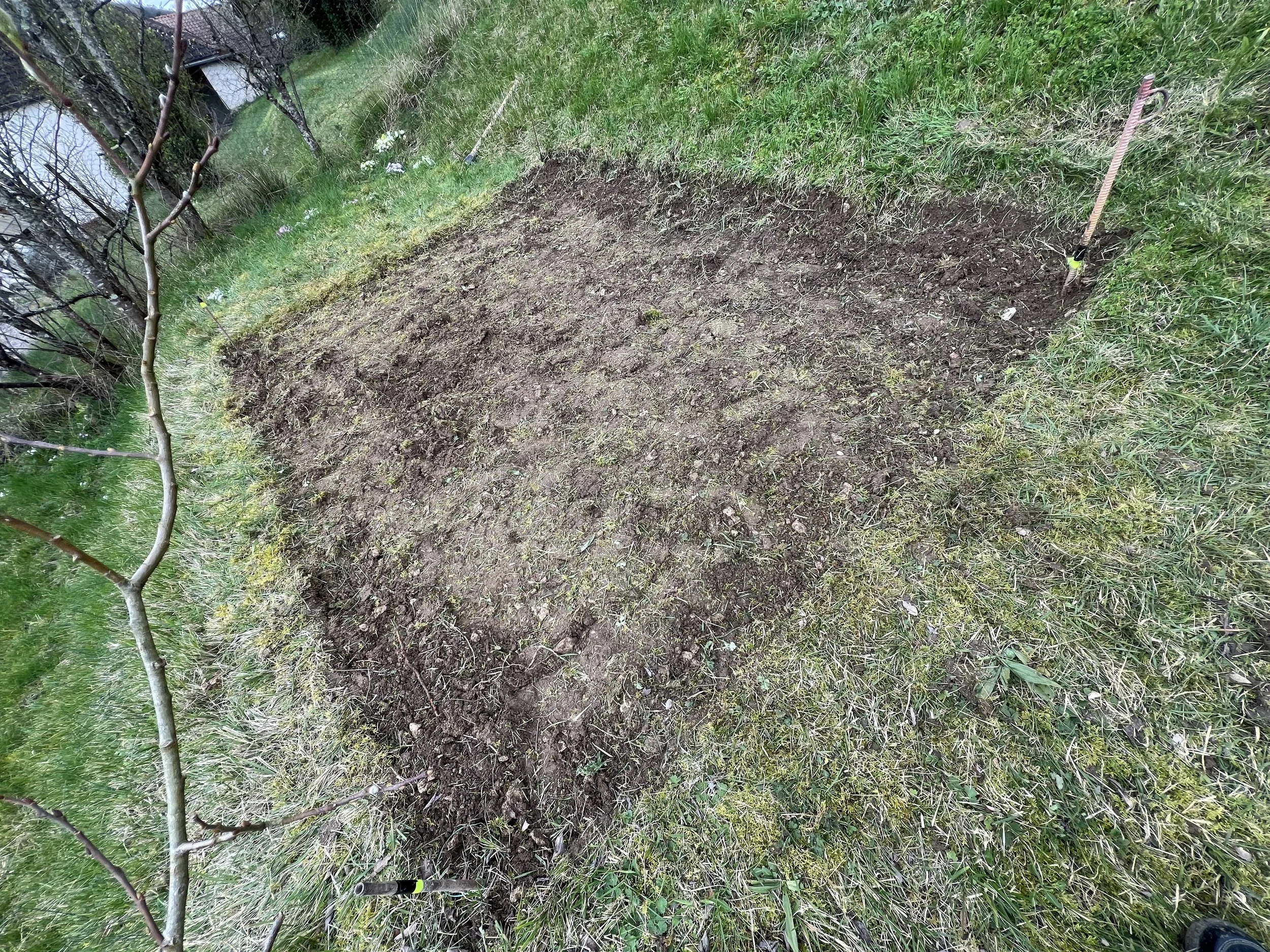 The plan is that he’ll scrape off the grass, level it out, lay down a membrane, then use gravel to help achieve the best level he can.