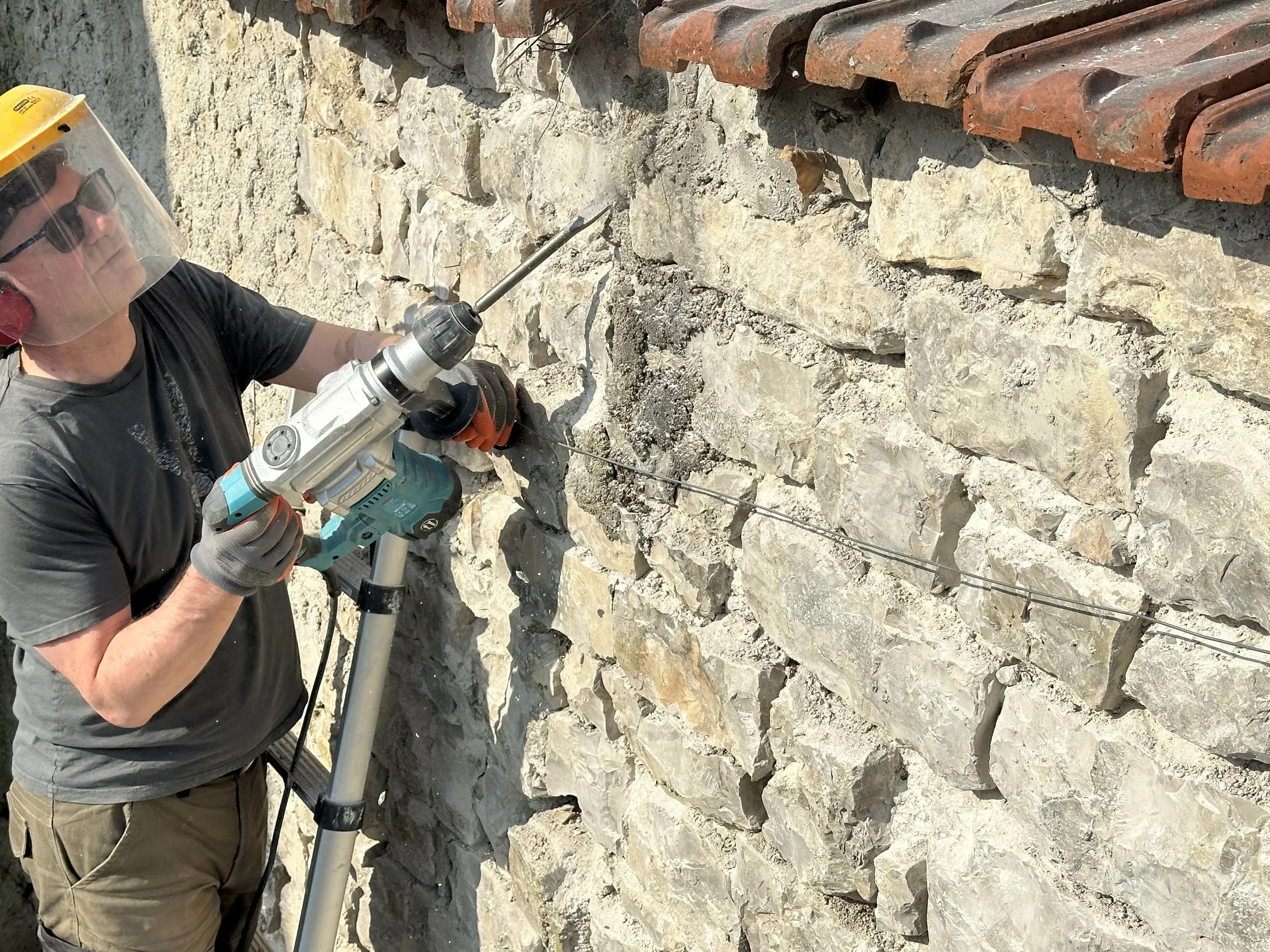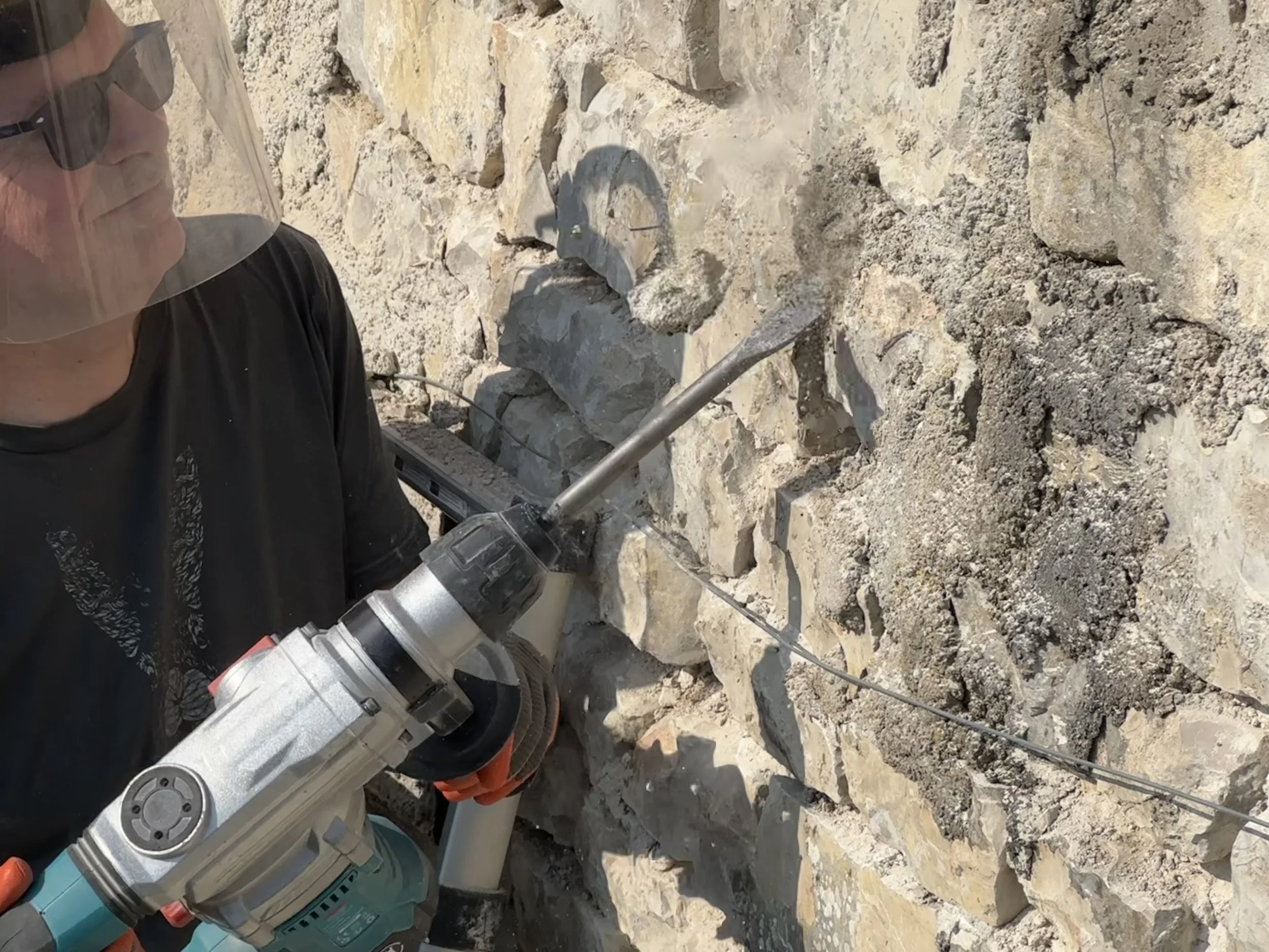 End of day two. It is very hard going on his hands and shoulders, the hammer drill is quite heavy, and combined with the vibration, it makes the whole process very difficult. However, it’s much quicker than doing it manually with a hammer and chisel!