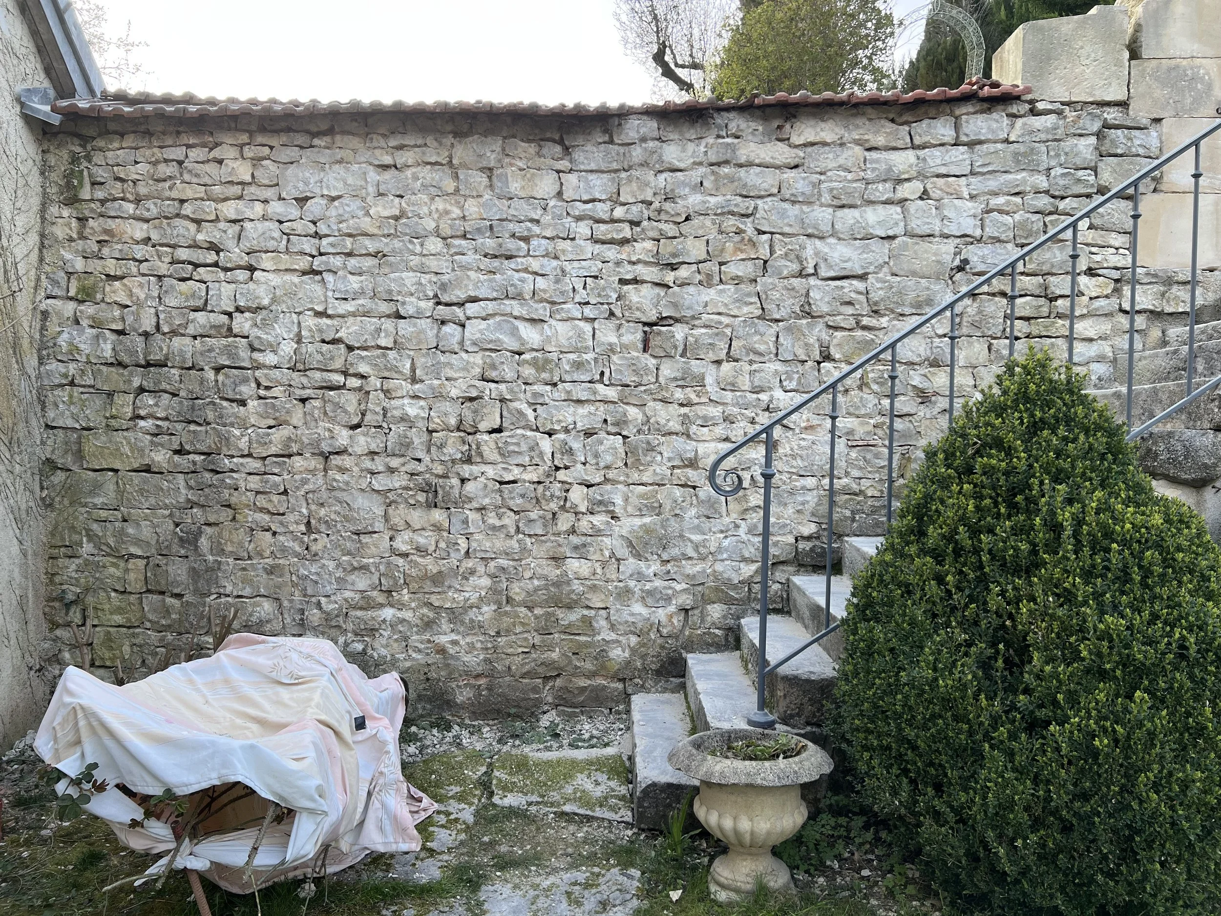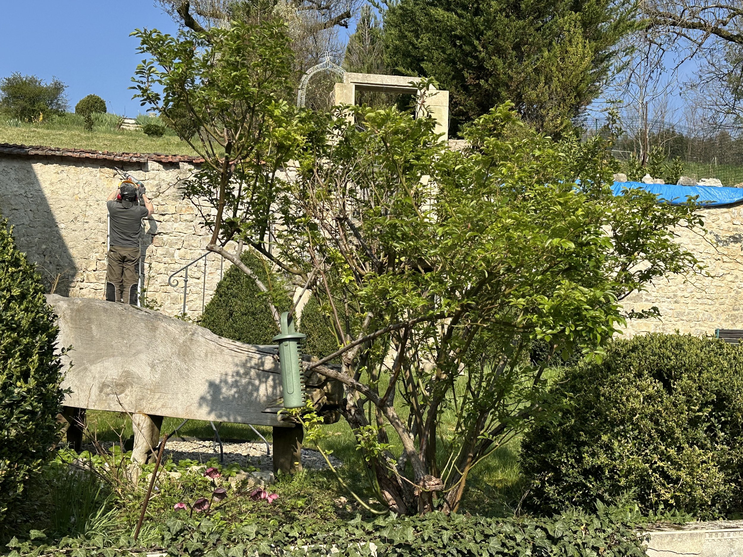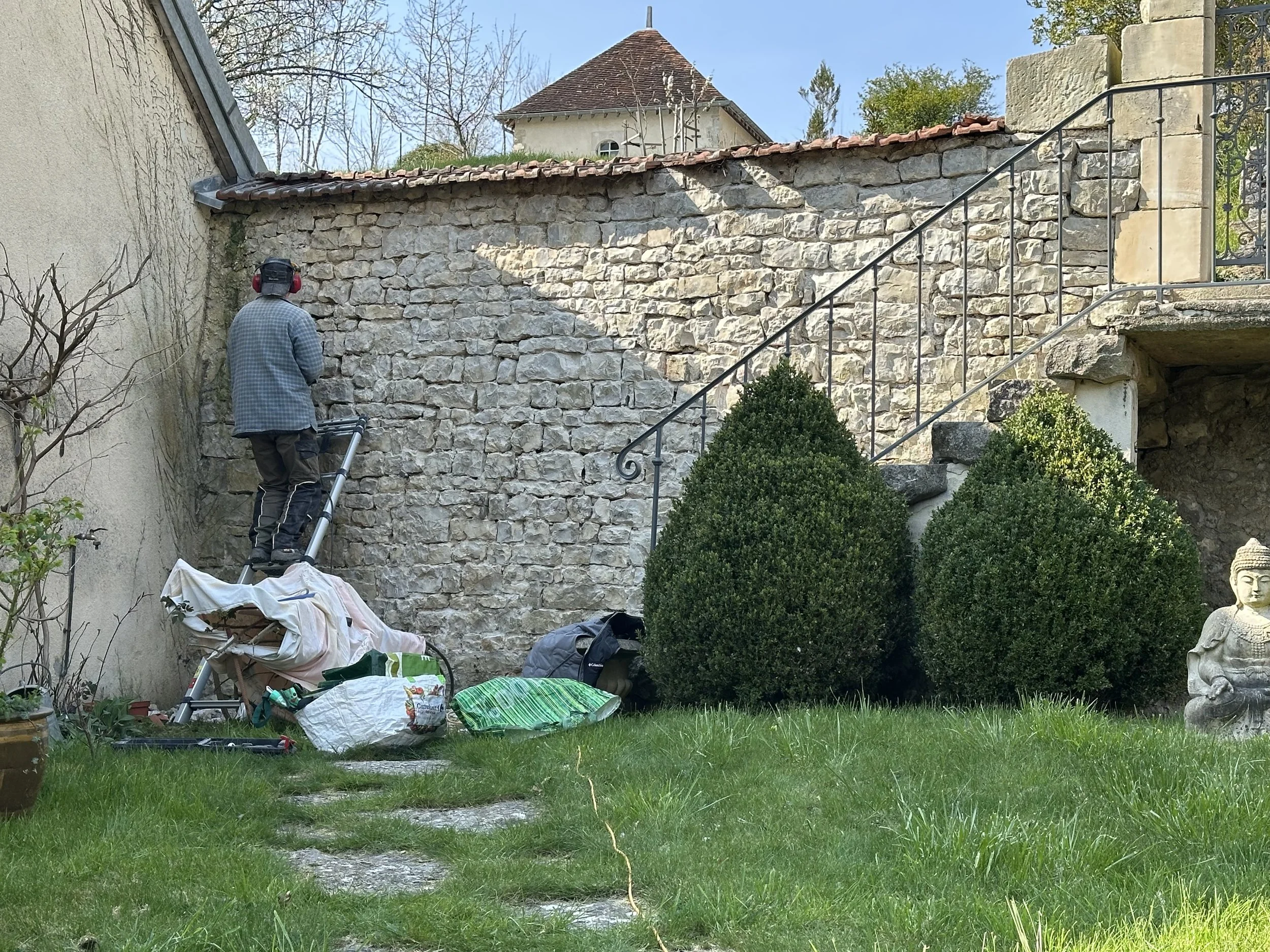 With a little encouragement from a friend, we decided the stone wall to the left of the steps needs the concrete chipping off, and the pointing replaced with chaux. It will be so much more in keeping with the wall on the right that they did last year.
