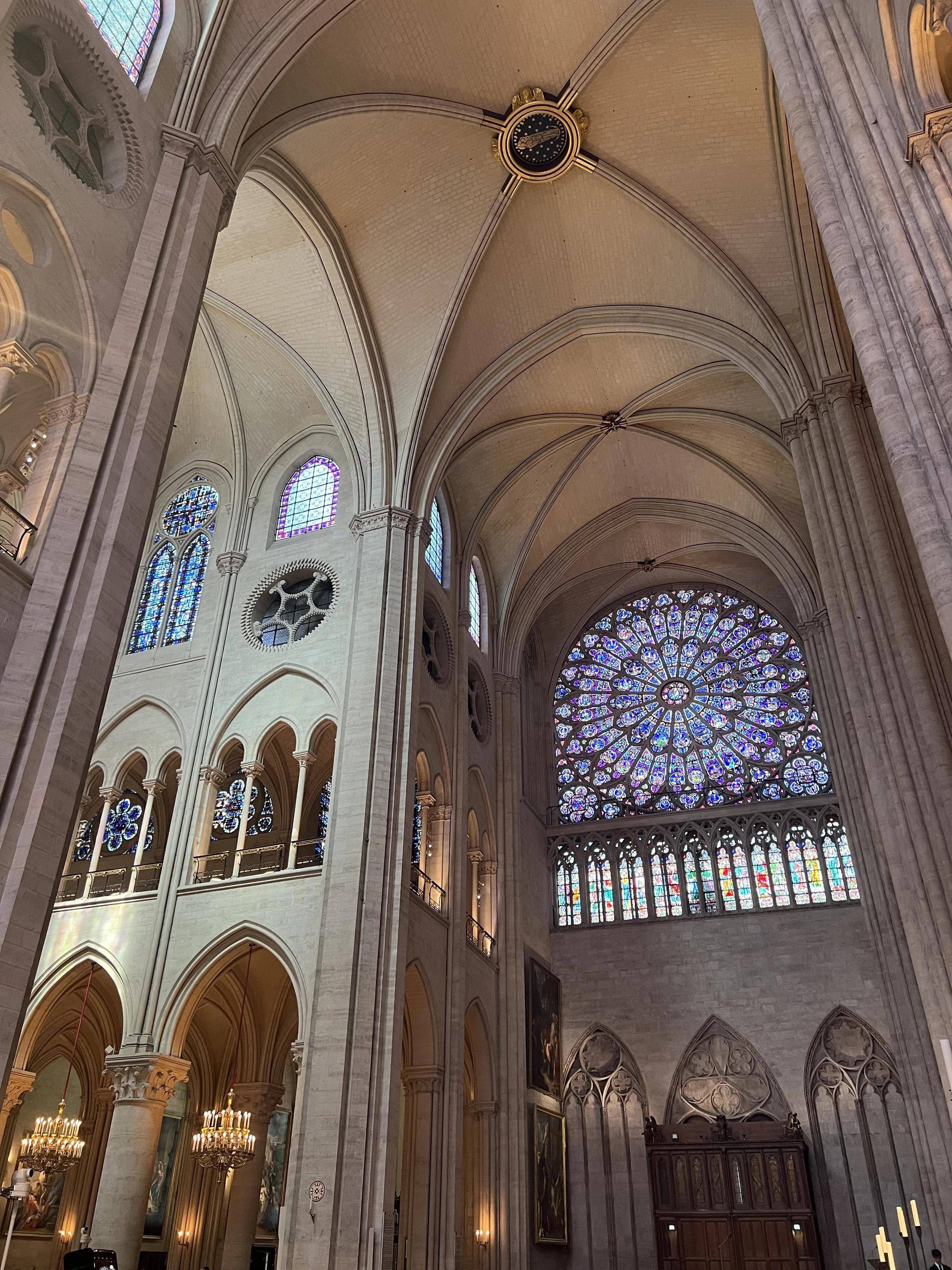 The skills most required were carpenters and stonemasons, as the fire had destroyed the cathedral’s wooden spire and most of the wooden roof. Although It had also severely damaged the cathedral's upper walls, the vaulted stone ceiling remained in place, largely containing the burning roof as it collapsed, preventing extensive damage to the interior. The emergency services and rescue teams managed to move many of the works of art and religious relics to safety, but some did suffer smoke damage, and some of the exterior art was damaged or destroyed. Miraculously the cathedral's altar, two pipe organs, and three 13th century rose windows suffered little or no damage, this was mainly due to the way that the emergency services managed the situation. Not aiming their hoses directly at the stained glass windows for instance meant that the damage to them was mostly from the smoke alone.