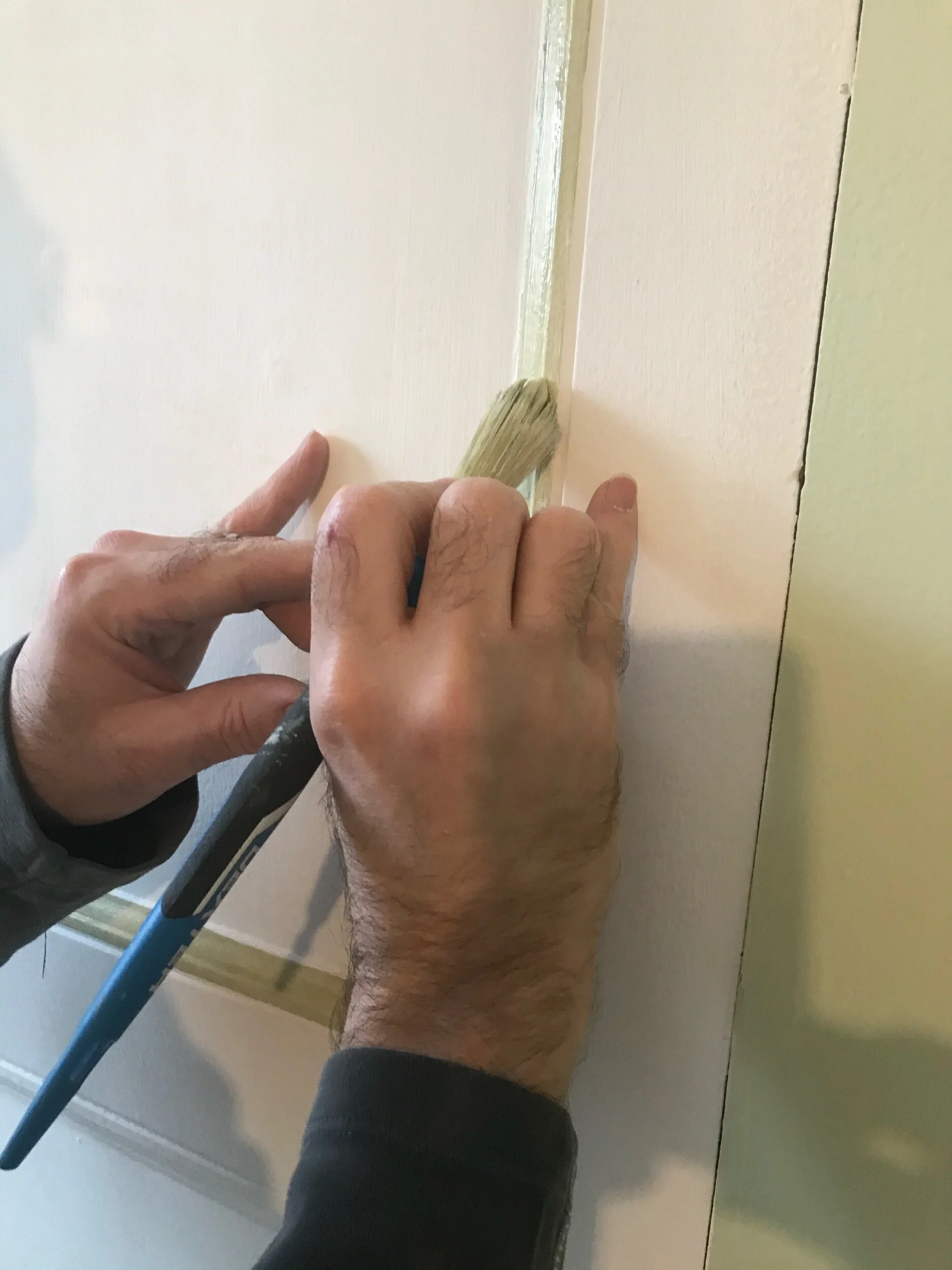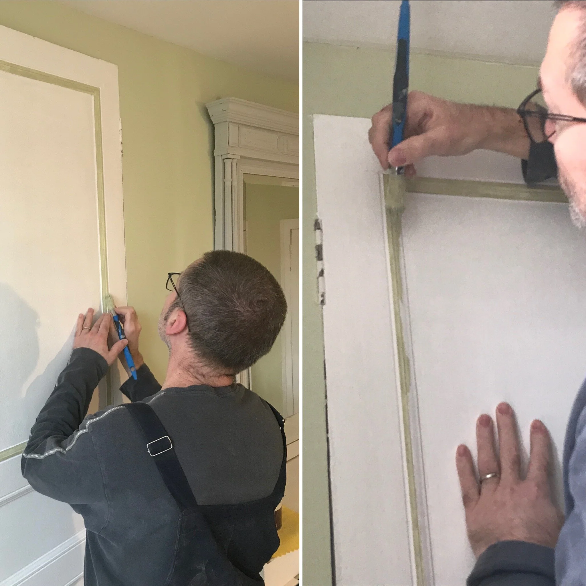 We wanted to add some extra detail to the room, and one of the areas we thought would be good to pick out was the styling on the doors, so yesterday Brian spent some time very carefully painting the moulding on the cupboard doors.