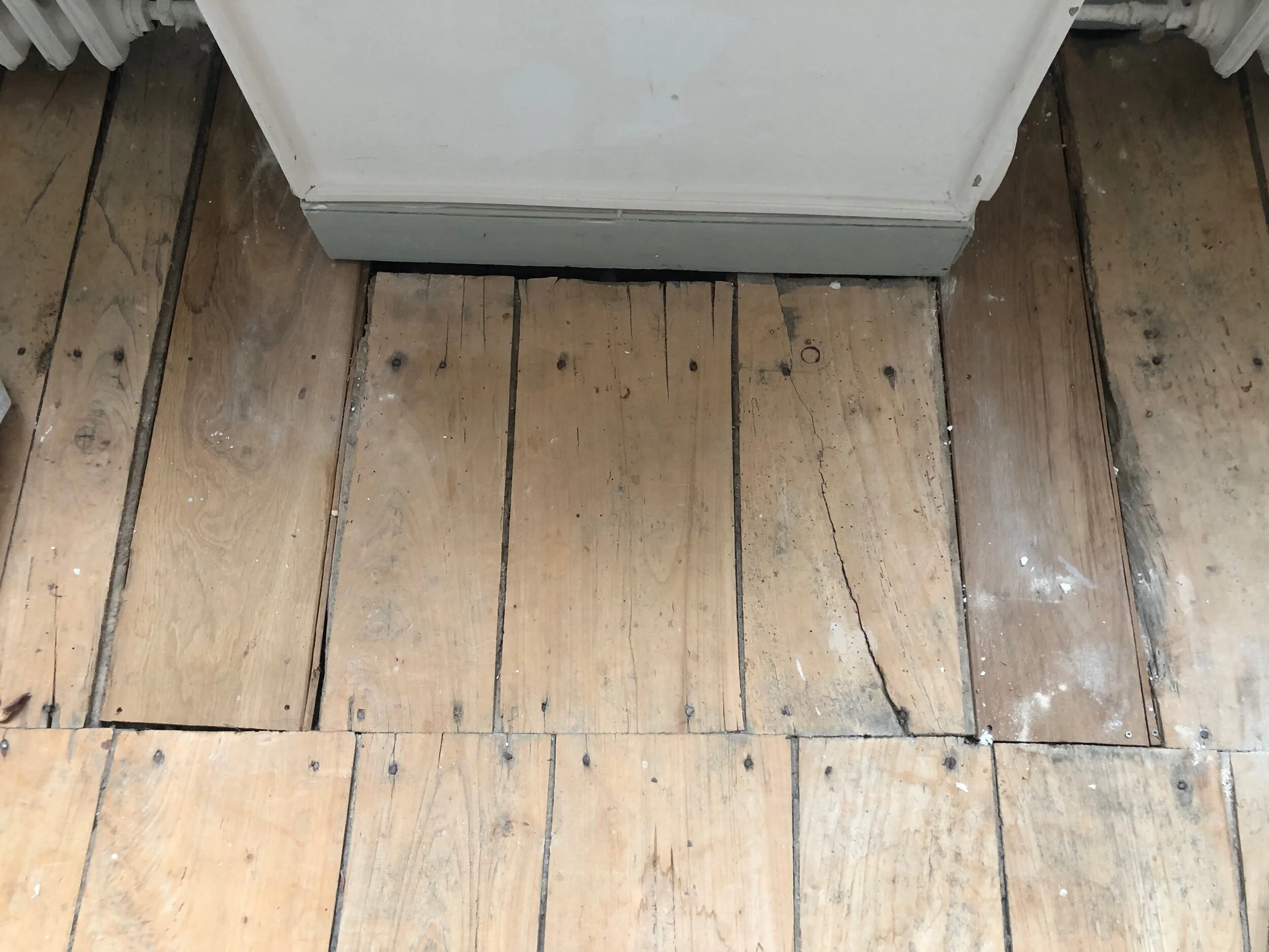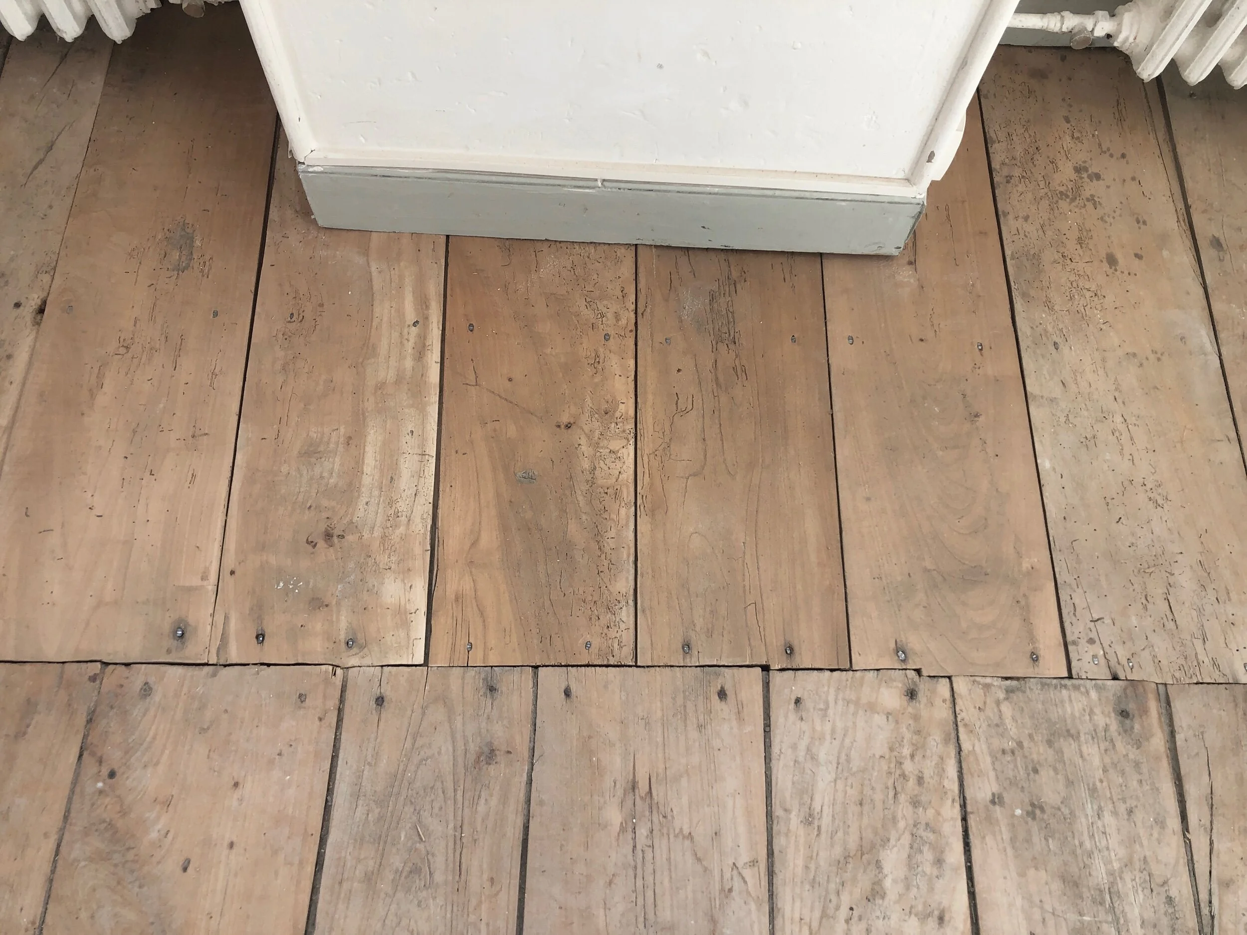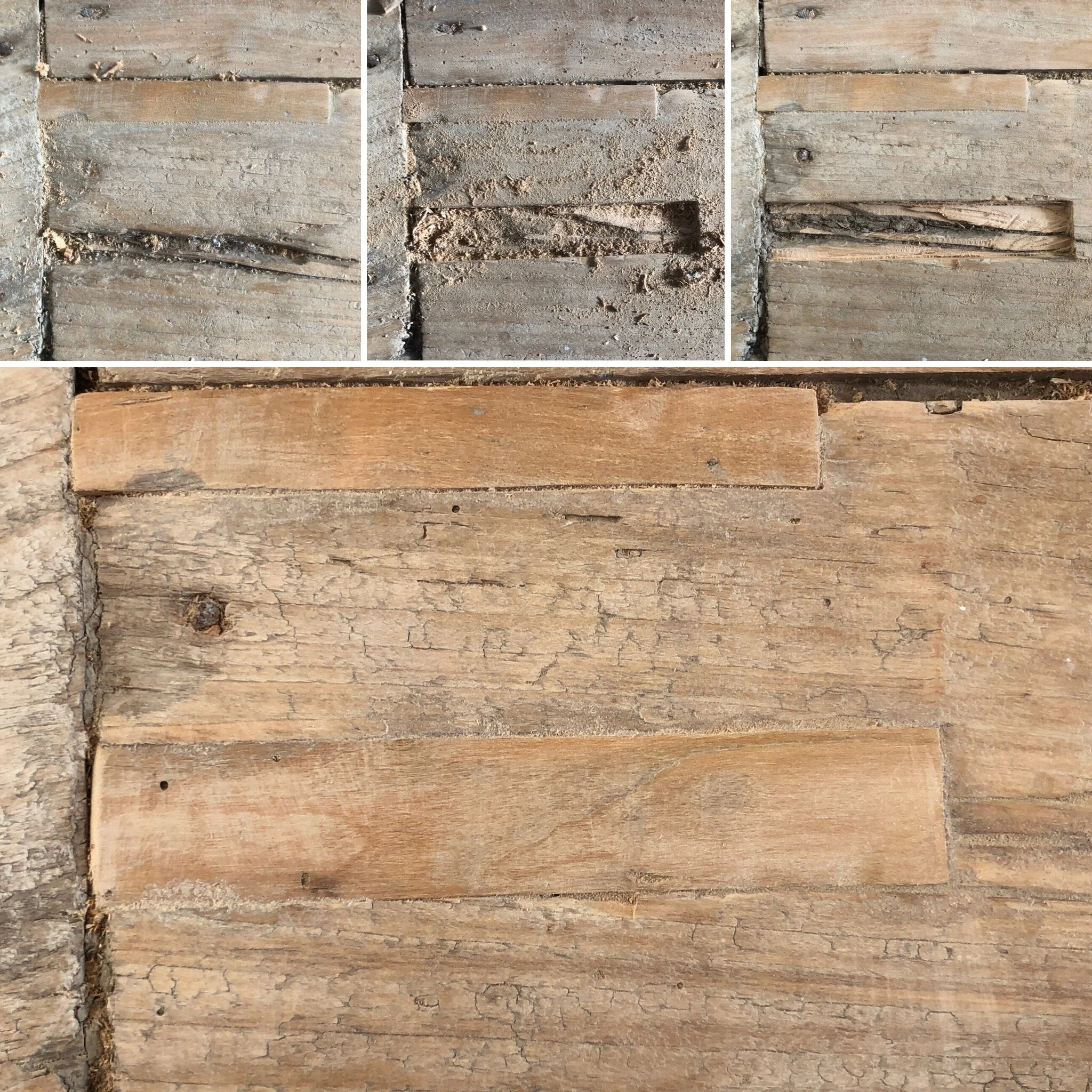Today Brian has been working on the floorboards in the Jeroboam, and he has made an amazing job of cleaning some of them up. Firstly he replaced a couple of small damaged pieces by cutting out the damaged area, then fitting a new piece in place.
