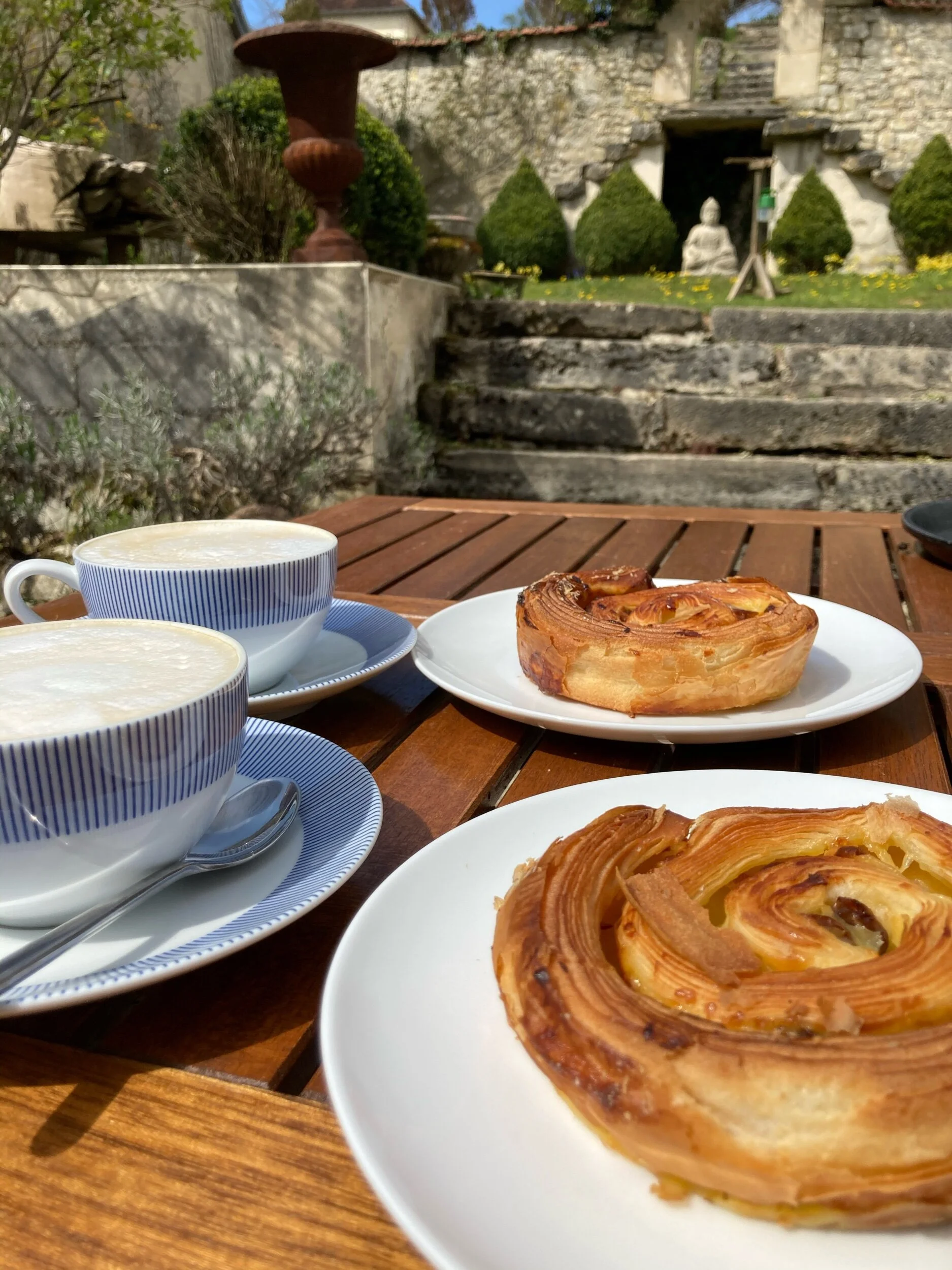 Once we got home the sun was shining and it was warm enough to enjoy our deliciously flaky pain au raisin with coffee outside in the garden.