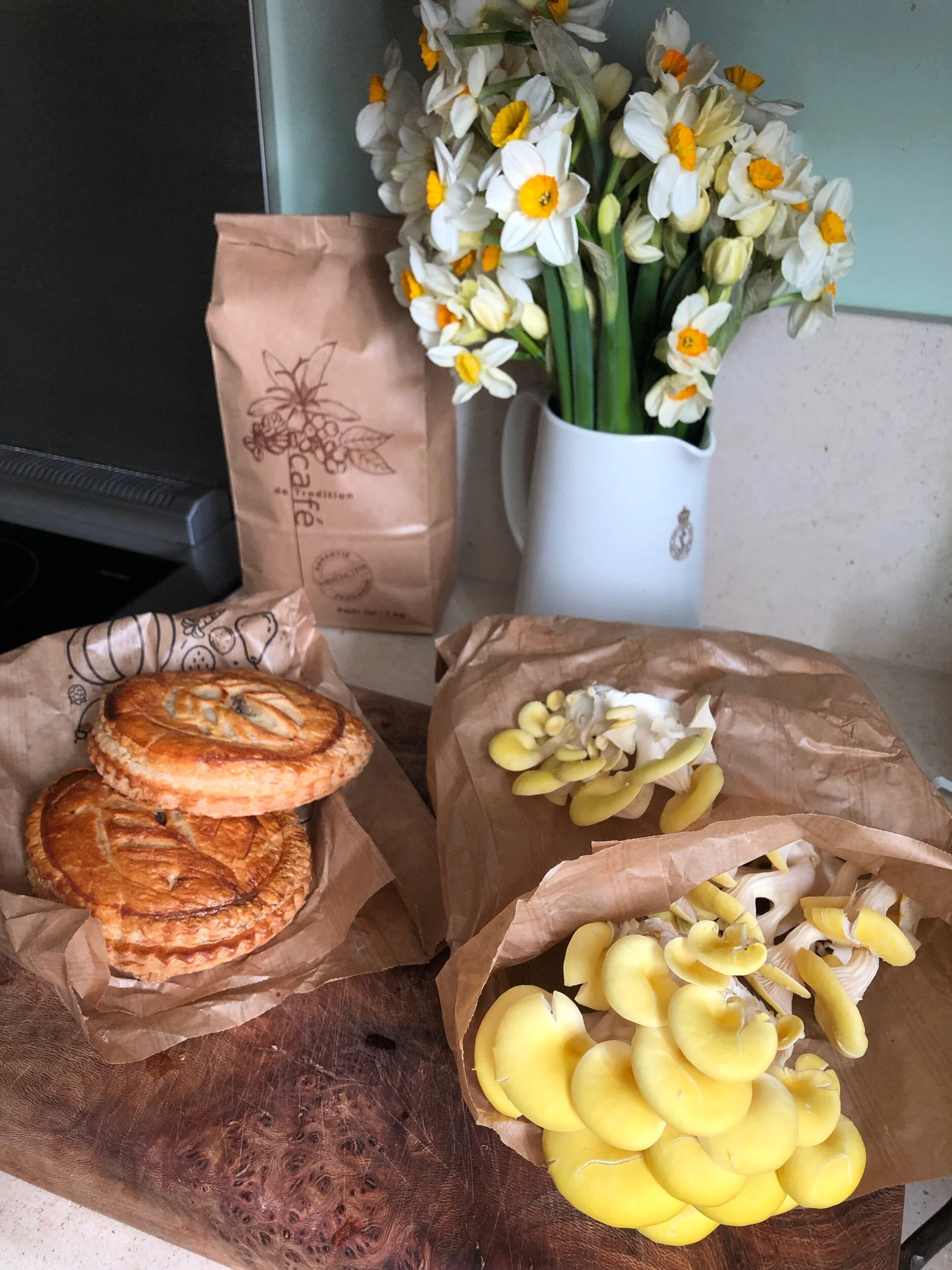 It’s been a delightful day. We headed off to the market first thing to get some of my favourite tasty treats for today. I also got some narcissus, which have a beautiful fresh spring perfume to them. Then there were the mushrooms. I just love mushrooms, and have never tried pleurotte jeune before, so really looking forward to tasting these later.