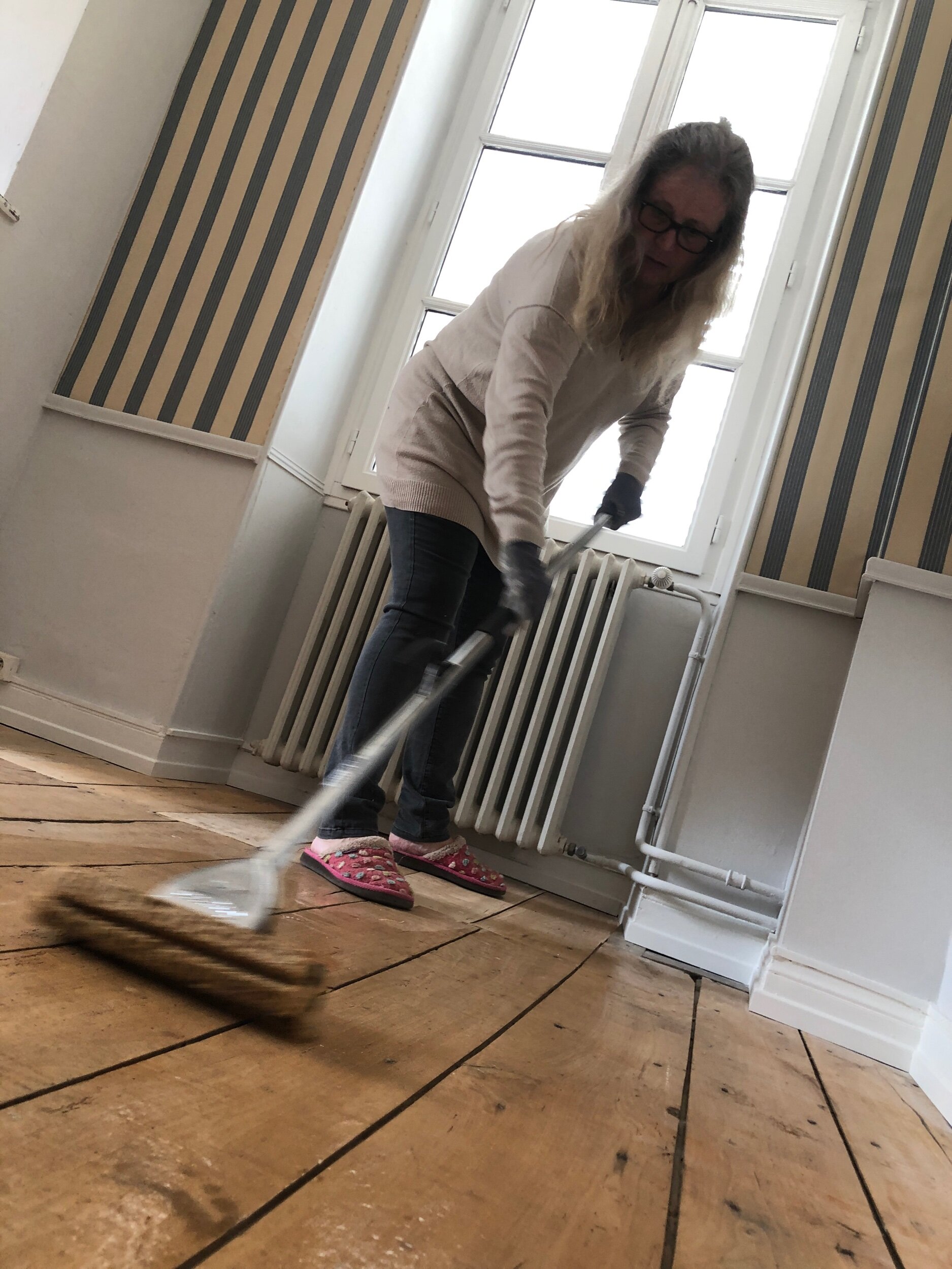 Today, I’ve been cleaning the windows whilst Brian has been waxing the floor. Once the wax has dried I buff it up with the polisher. I like to let it dry further overnight before giving it a final polish, it just allows the polish to soak into the wood. We are now looking forward to putting the furniture back in tomorrow.