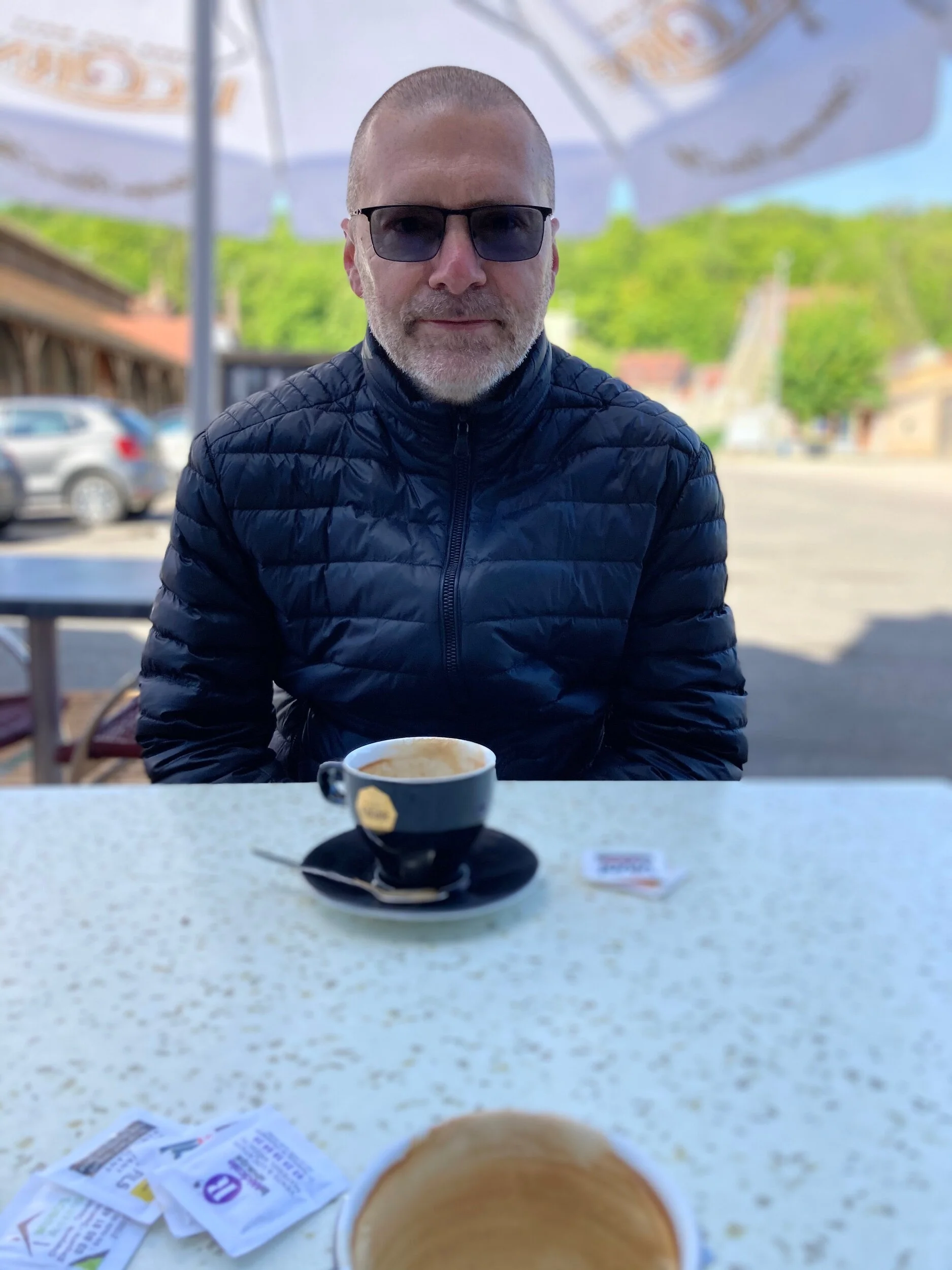 This morning we needed to collect the flooring we had ordered for the ‘atelier’, so we thought we’d take the opportunity and support our local café. The sun was shining, however it was still a little chilly, but the cafe was not busy, so it was an ideal time to sit outside and enjoy our first coffee at our favourite little market cafe for a very long time.