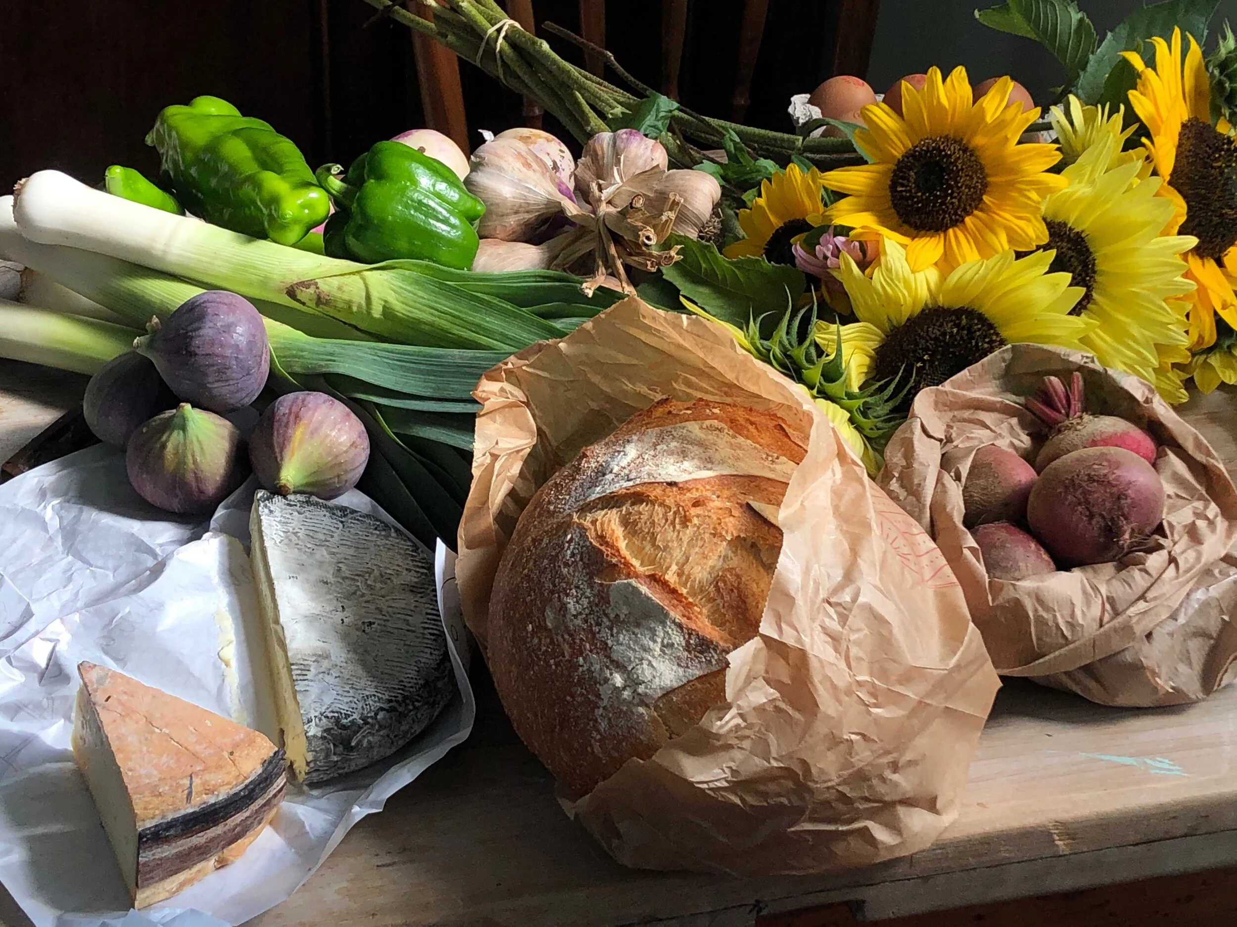 There’s a stall at the market that sells locally grown flowers, along with all locally grown vegetables. Some I’m not certain I know how to cook, but I know over time I will discover some recipes. This week there was a ‘radis noir’. It looked a bit like salsify, but fatter than I’d seen them before, so not quite sure if you treat them the same. This week though I wanted to buy baby turnips, beetroot, some bright shiny green peppers, a few leeks and the last of the sunflowers. I got these for all less than 10 euros. Oh, and I/2 kilo of garlic, which was 3 euros.