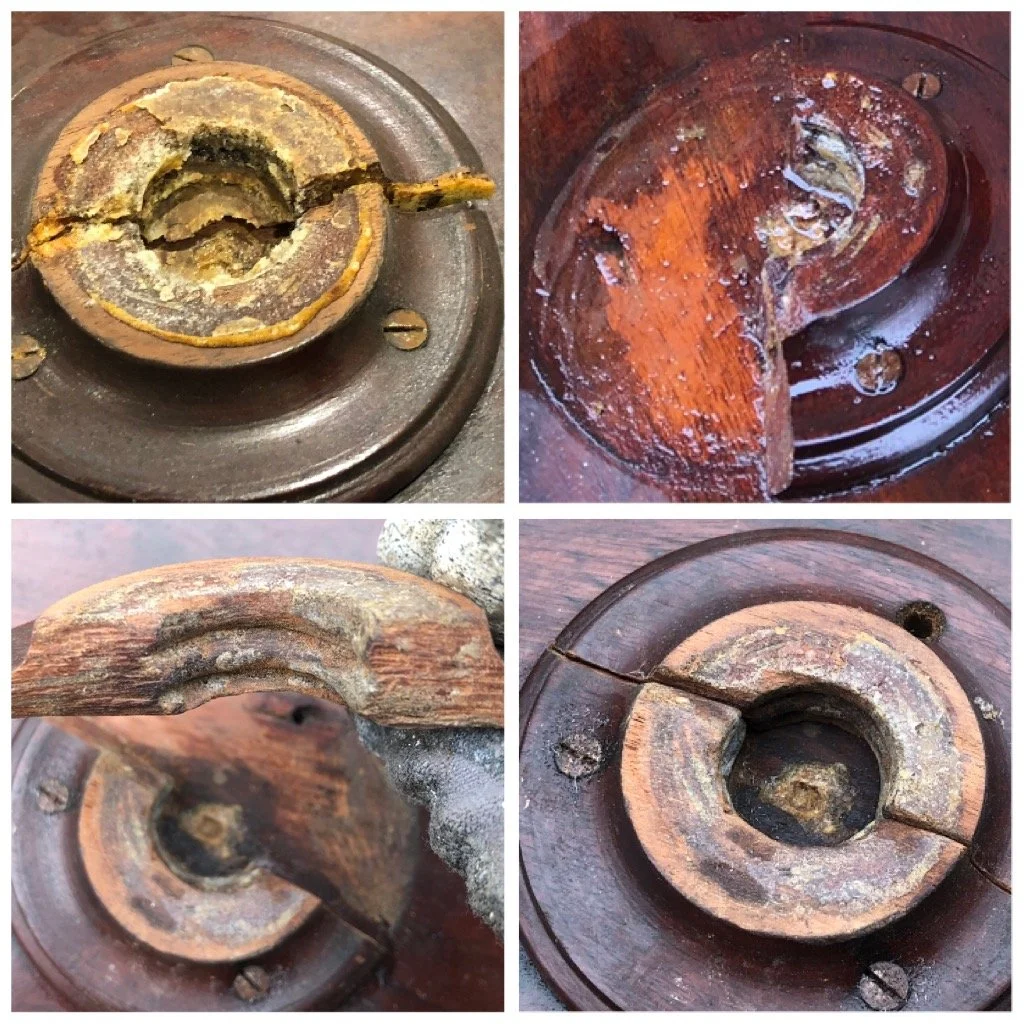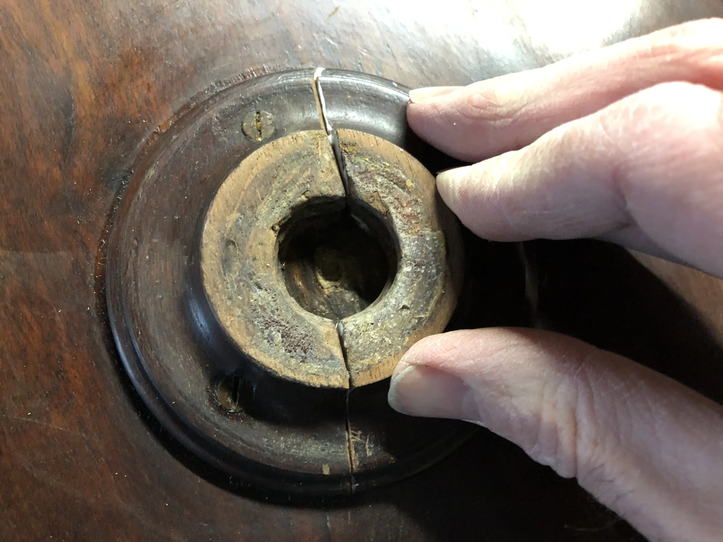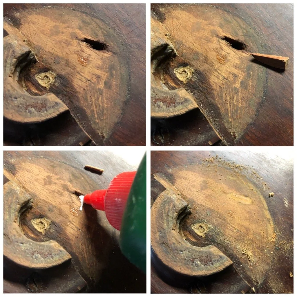 The threads are visible now on the spindle and the wooden fixing, so hopefully they will still have enough structure to twist together. The cleanup also revealed a small screw hole that had become too wide and needed closing up to help with the strength of the table top fitting.