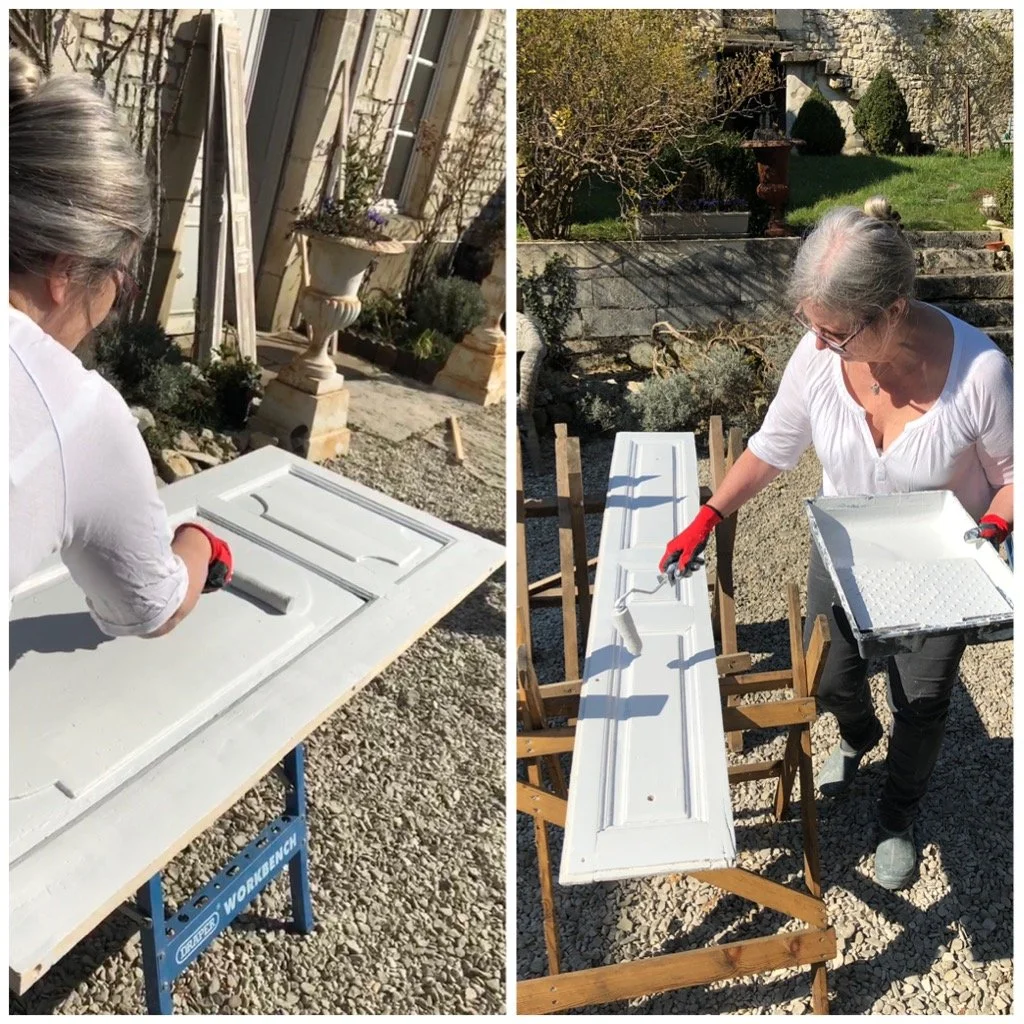 It has been gorgeous weather, and I grabbed the opportunity to work outside on painting the panels we had removed from around the windows.