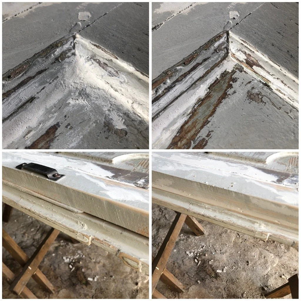 It wasn’t long before we were back finishing the salon cupboard doors. Brian had finished filling the first pair and was now working on the second pair. They were taking a lot of work filling, sanding and more filling, but they’re starting to look really solid once more.