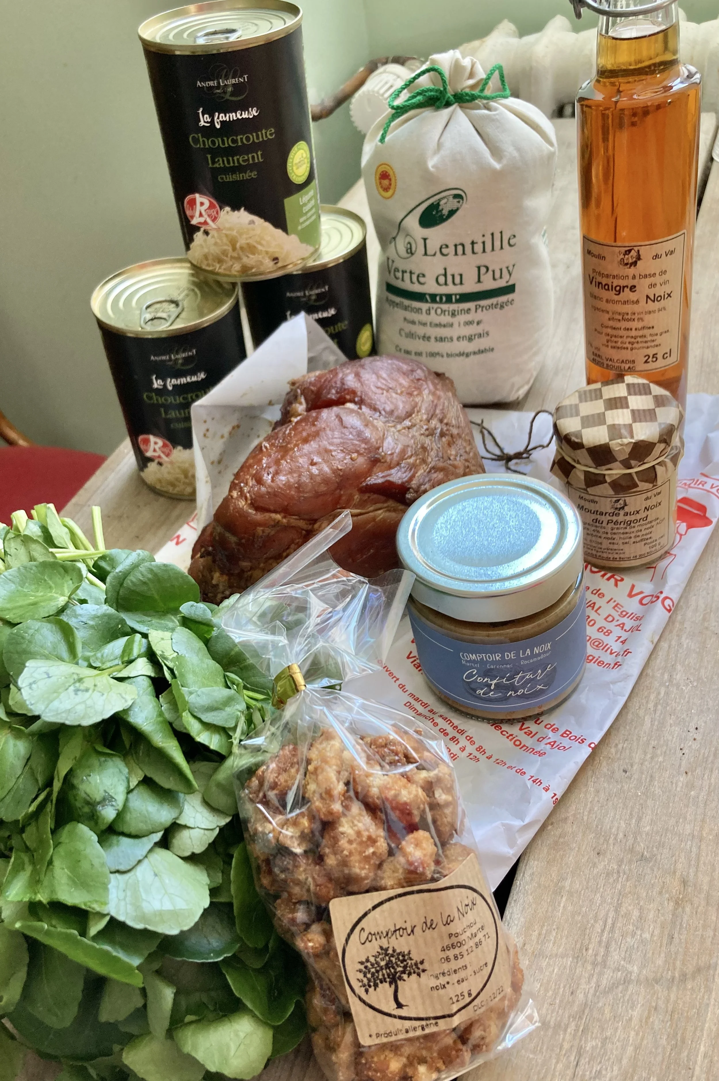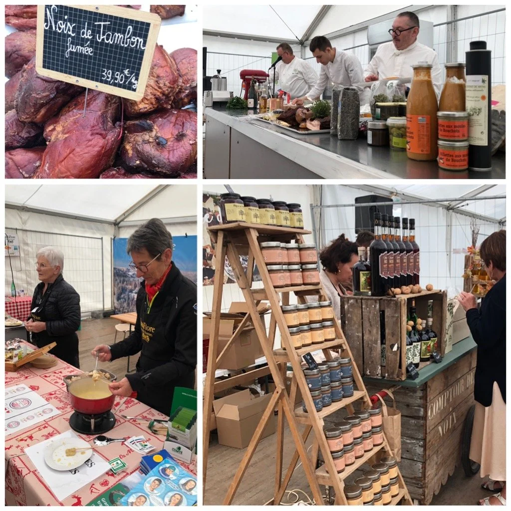 Today we visited the spring festival of food in Les Riceys with some friends. Les Riceys is a delightful little village not far from us. The food festival was being held in a group of marquees near the ‘Mairie’, and was showcasing delicacies from all over France; cheeses, meats, nut products, oils, flours, jams, cakes to name a few, and of course wines and spirits. It was very well organised, and each stall offered tastings, and ideas on how to use their produce. The first thing we tasted was the smoked ham, which was delicious, so of course we had to buy some to enjoy at home.
