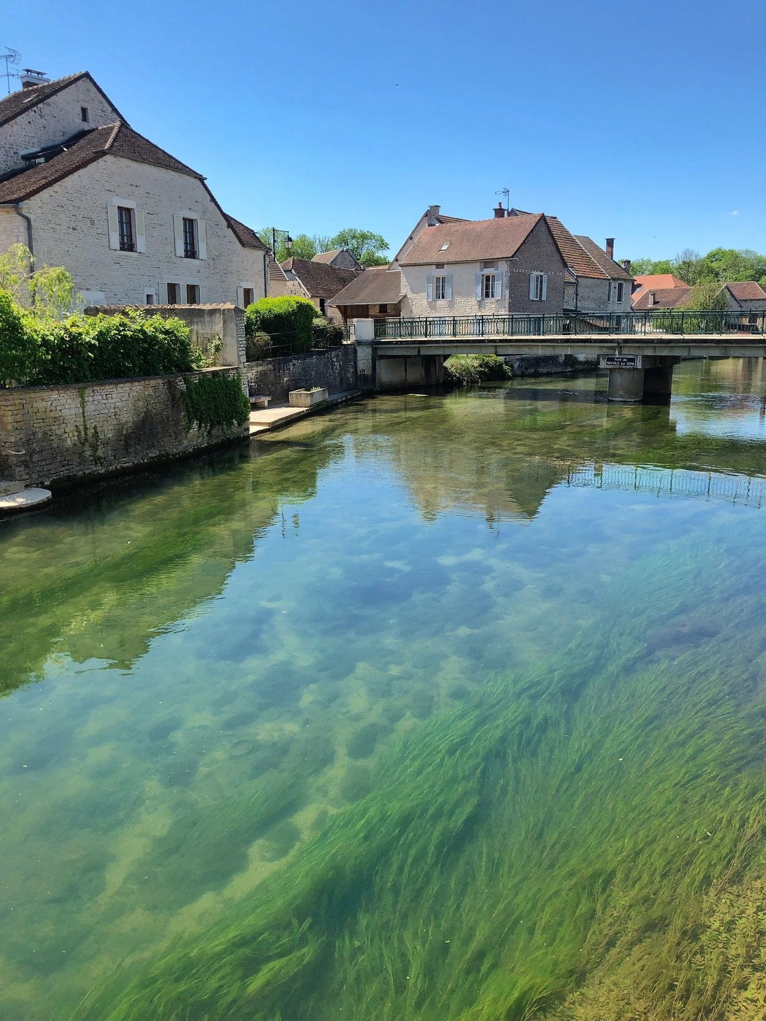 We decided to do a champagne tasting after lunch. I had seen Moutard advertise, and thought they would be a good one to visit. They are in the small village of Buxieres, about 15 minutes from us. It was about 1.45pm, and not yet open, so we went to take a look at the river in Neuville-sur -Seine. It was a crystal clear deep green colour, and full of fish, that we watched for a while darting amongst the weed, nibbling for their lunch.