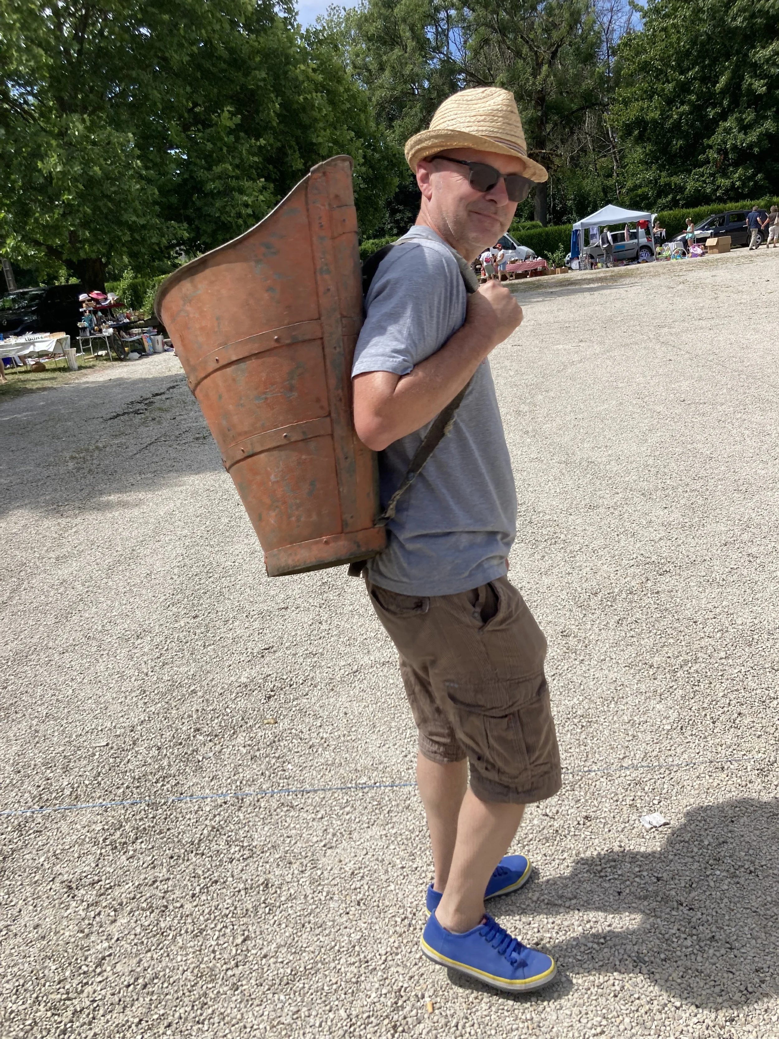 There was a stall where the guy was selling some beautiful old railway models. They were simply gorgeous, and something we hadn’t seen before. He also had lots of vintage games, but we resisted these. What we couldn’t resist though was an old metal grape collection bucket, that would have been carried on your back and used during the harvest (vendange). Just need to think where it might go now, I think Brian will be looking to have it in his cellar.