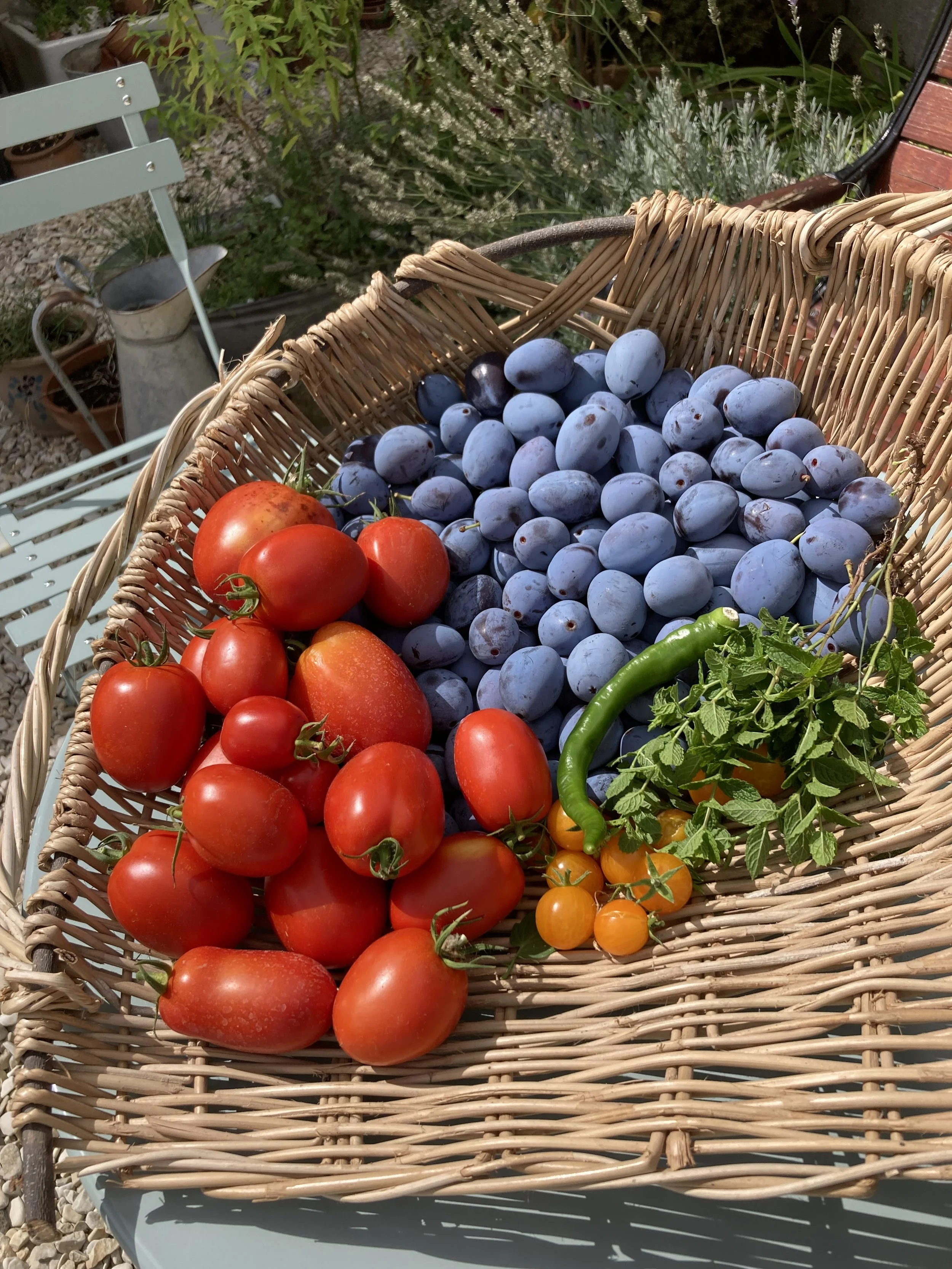 There’s something glorious about harvesting your own fruit and veg. Throughout the summer I’ve been enjoying picking my tomatoes, and earlier this week we picked our plums. Unlike last year, when we didn’t have any plums, we have had quite a good crop. I’m hoping I’ll have enough to make some jam, as my plum jam has been going down very well with our guests.