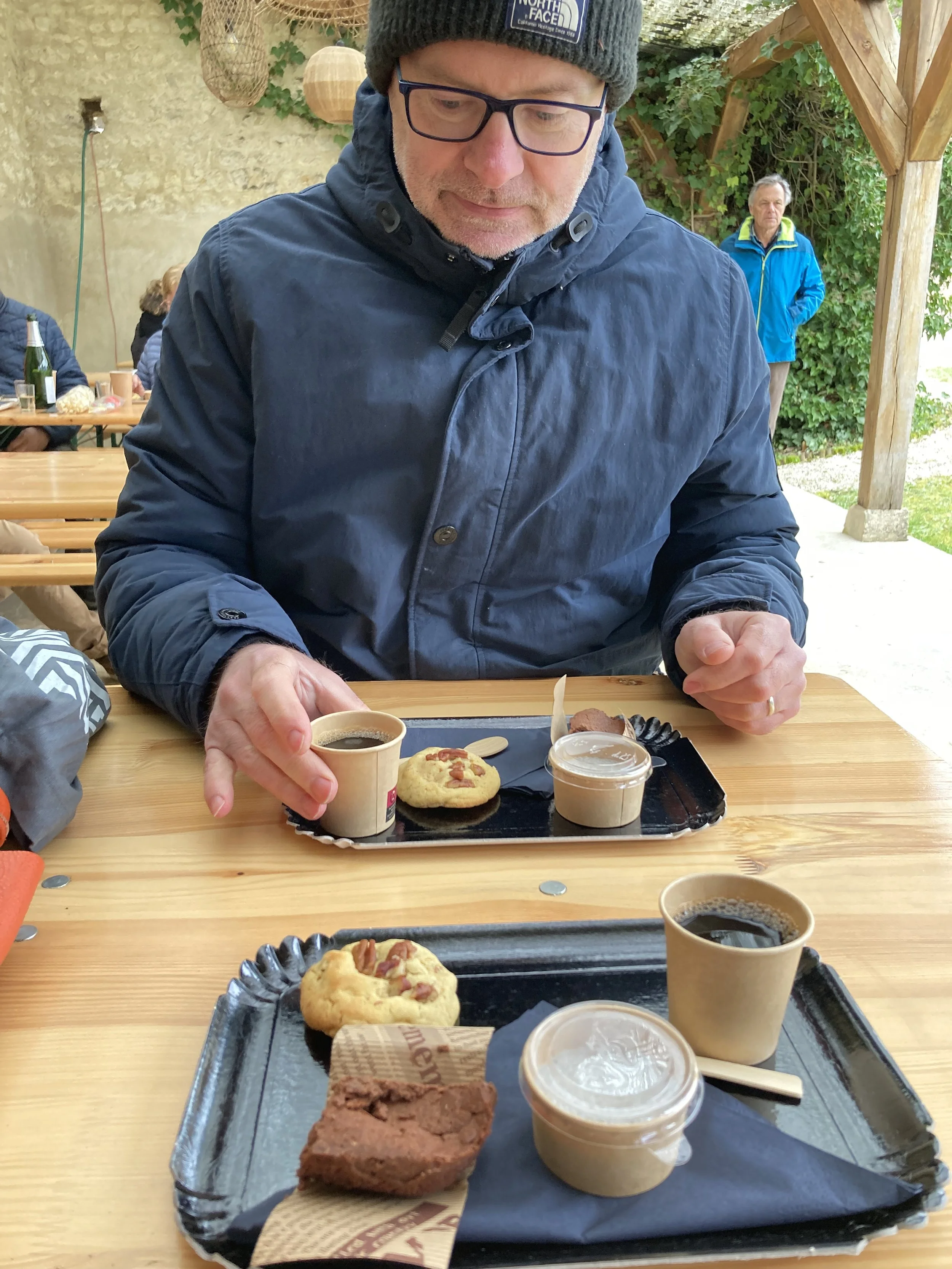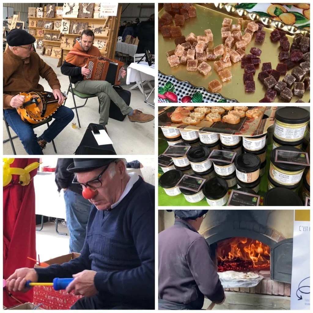 Our first visit was in the little village of Fourcheres. There is a small microbrewery there, with an épicerie next to it. They had invited lots of other small local producers to have stalls in one of their barns. It was such a fun atmosphere to get the day started, with local musicians and a balloon magician for the kids.