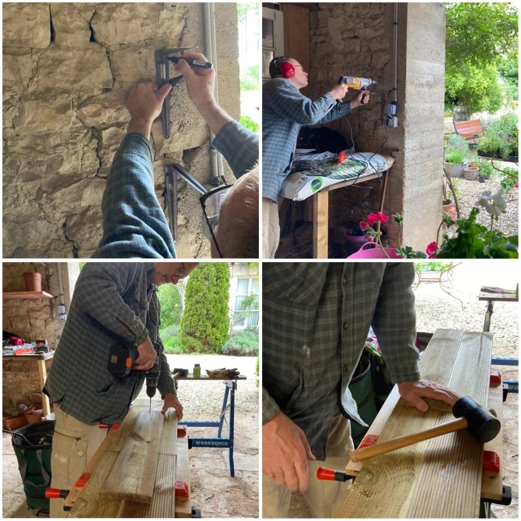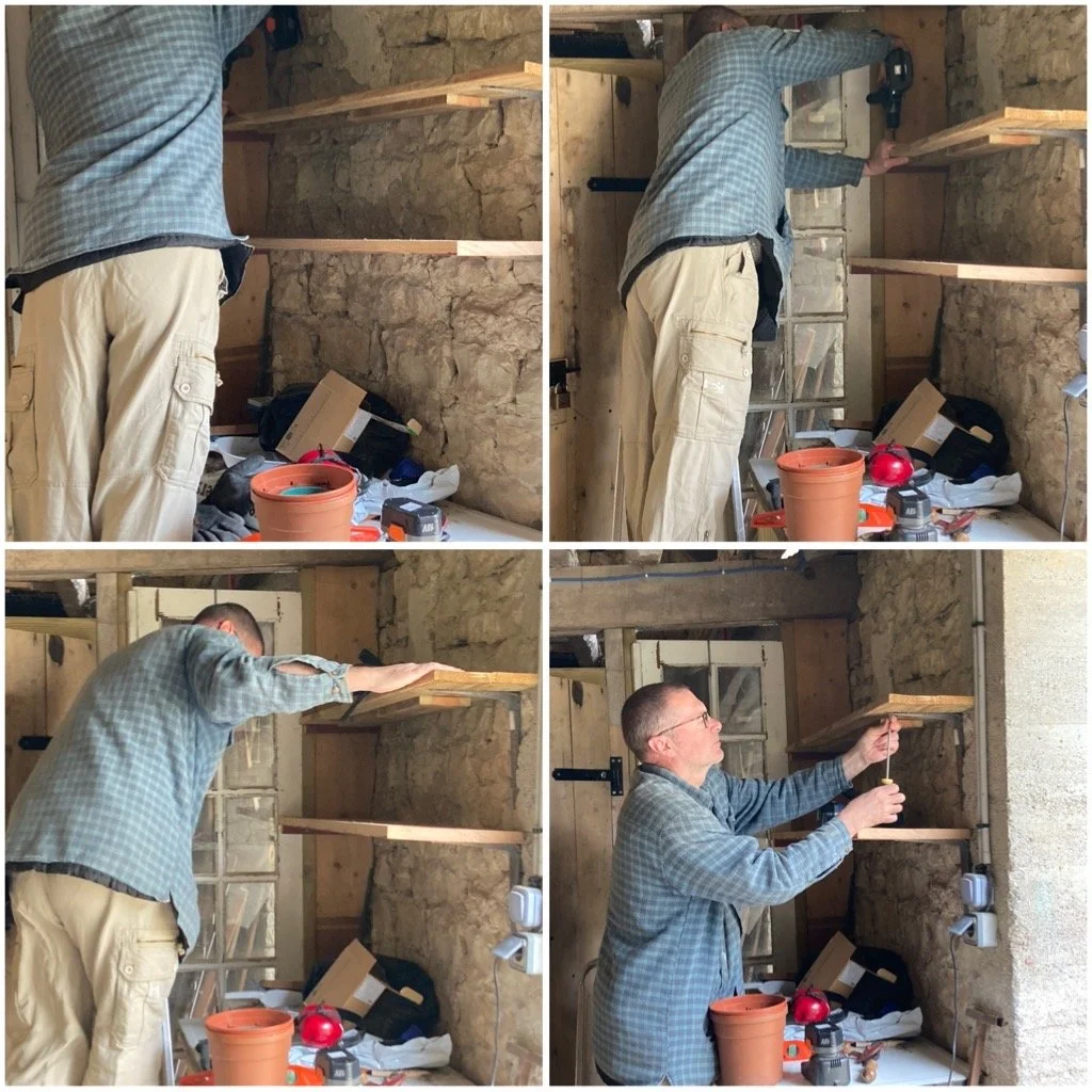 He got to work fitting the shelves, having to fix a few bits of wood together for one, as he didn’t have any pieces long enough. I just need to get myself organised now and it will be a perfect potting area.