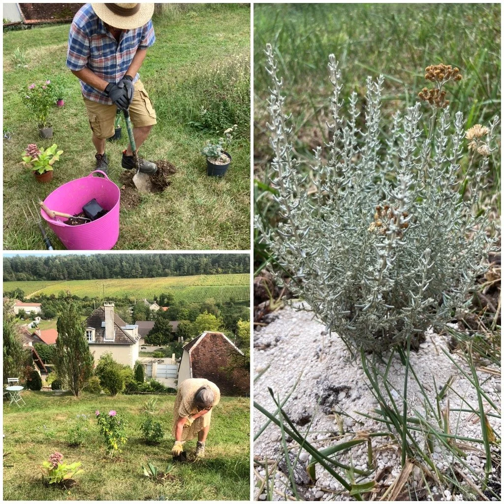 We laid them out, giving them plenty of room for growth. At this stage I’m leaving the grass in place, I will see how this goes over the next 6 months. At the top of the slope I’ve included a curry plant, which apparently loves a dry sandy soil. Fingers crossed this will like where I’ve put it.
