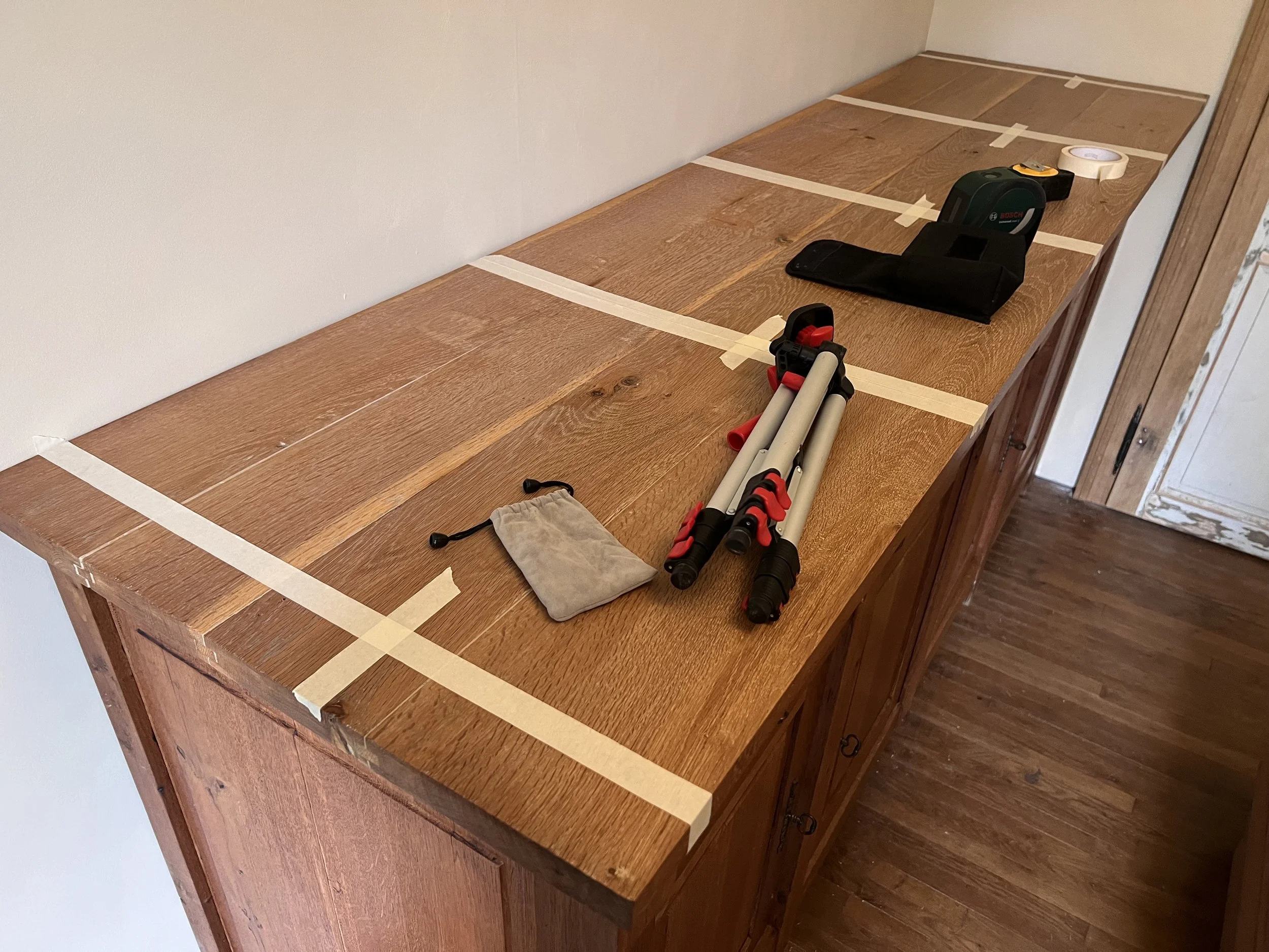 With that done, he moved on to marking up where the uprights for the shelves were going to go. Trusty laser at hand, he was soon confident that his marks were going to give him the precision he needed.