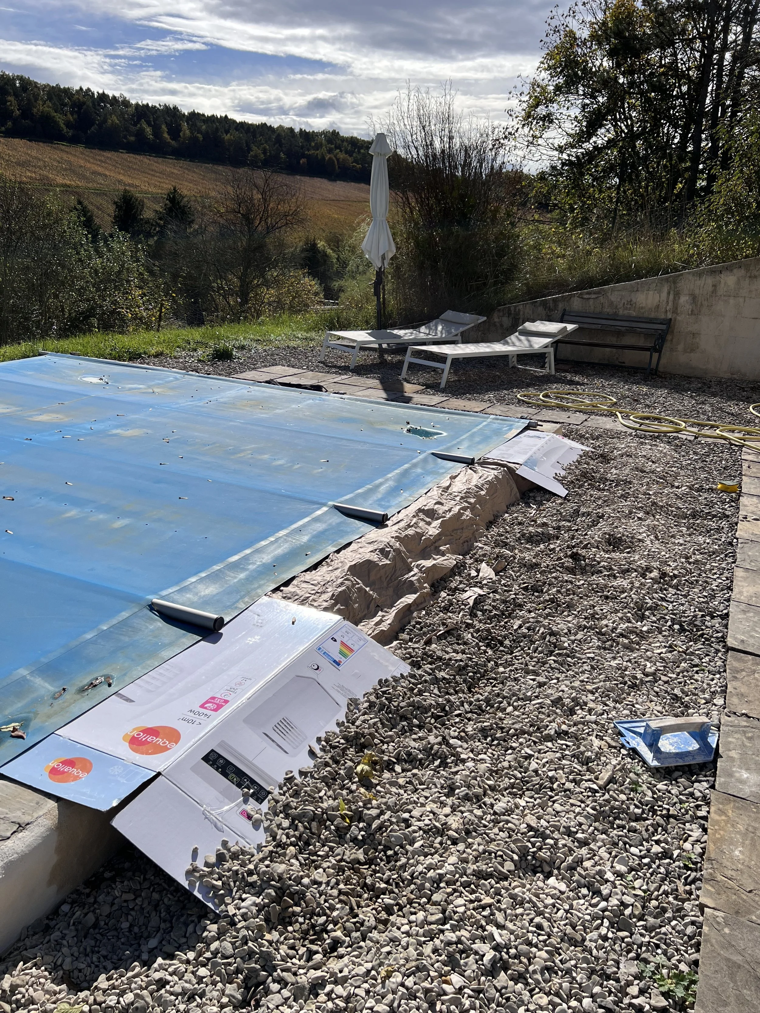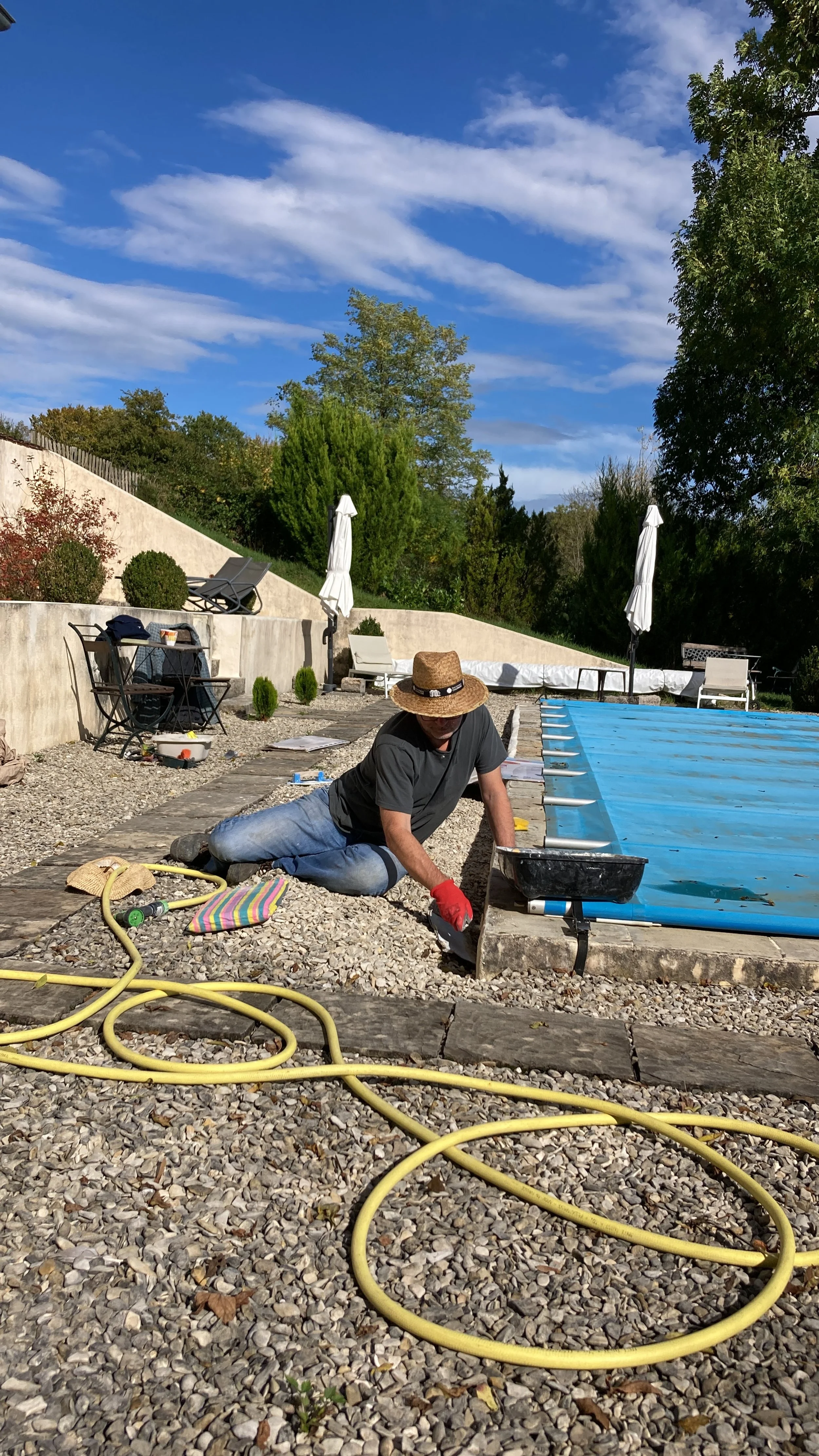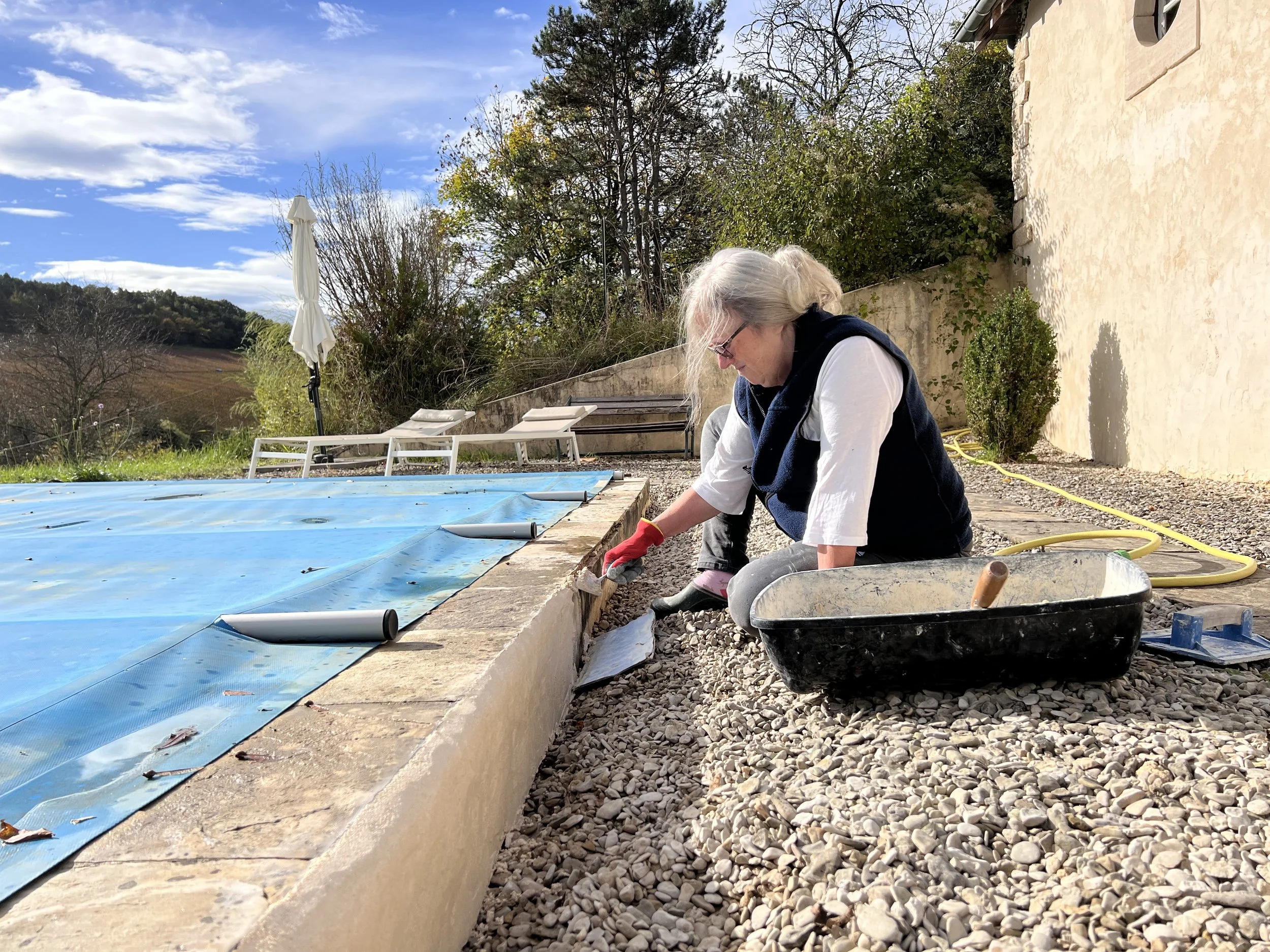 It was another beautiful autumn day today, and we decided it was an ideal day to head up to the pool and try and finish off the chaux work along the edge of the paving stones.