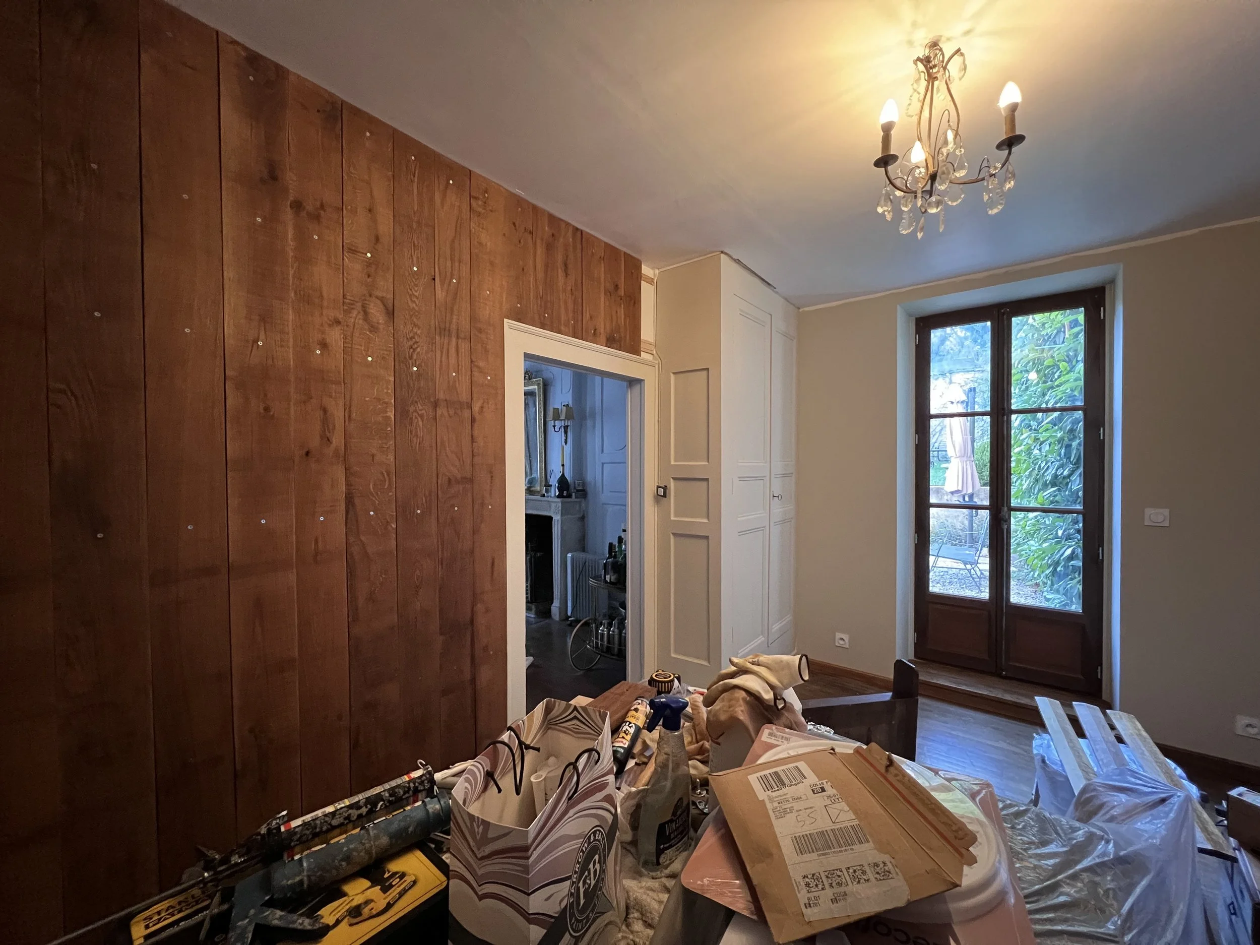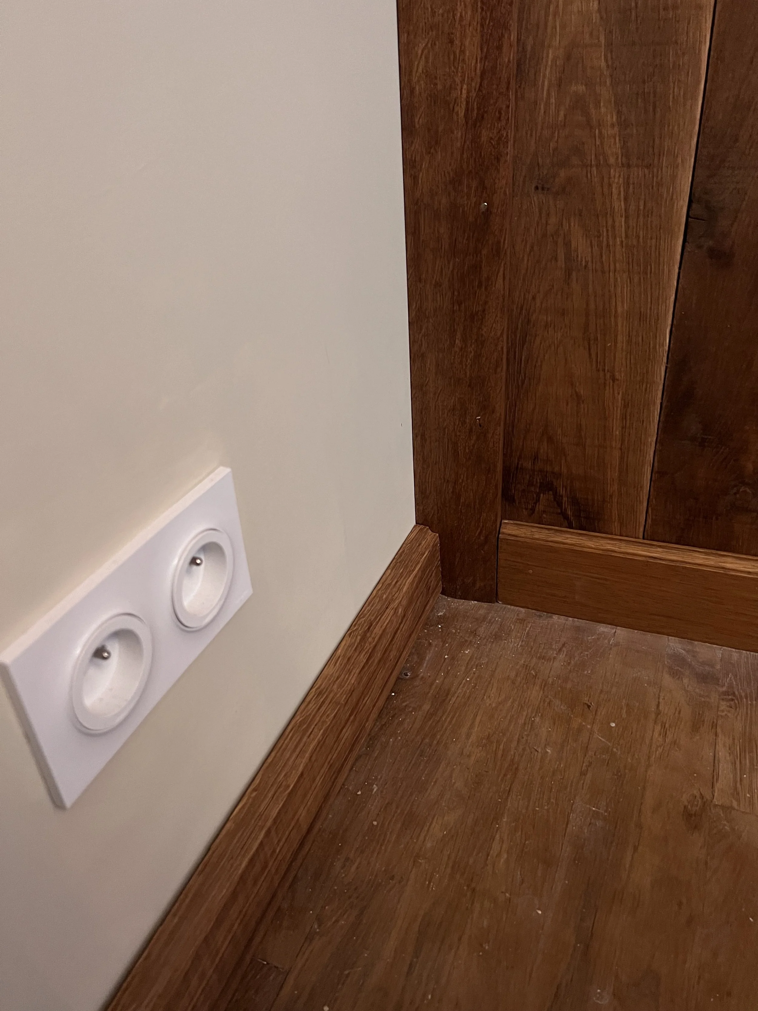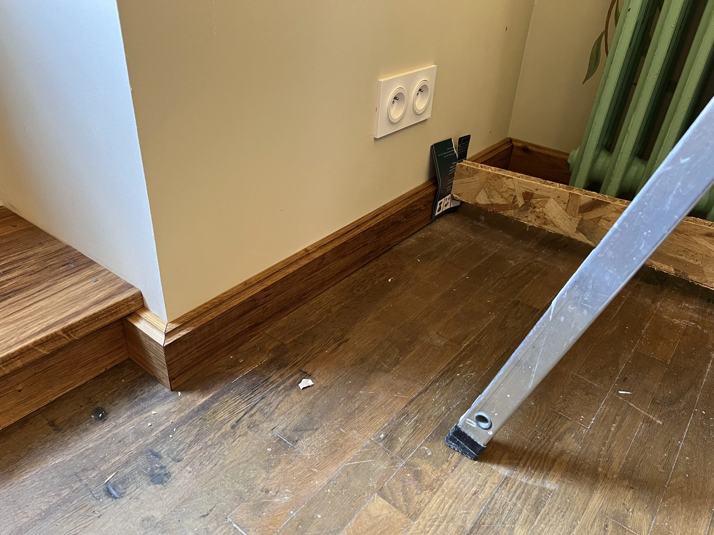 Brian started by fixing the skirting. I’d already linseeded it all, so he just needed to glue it into place. It was a bit tricky behind the radiator but he soon has it sorted and set up a wood support to hold it into place .