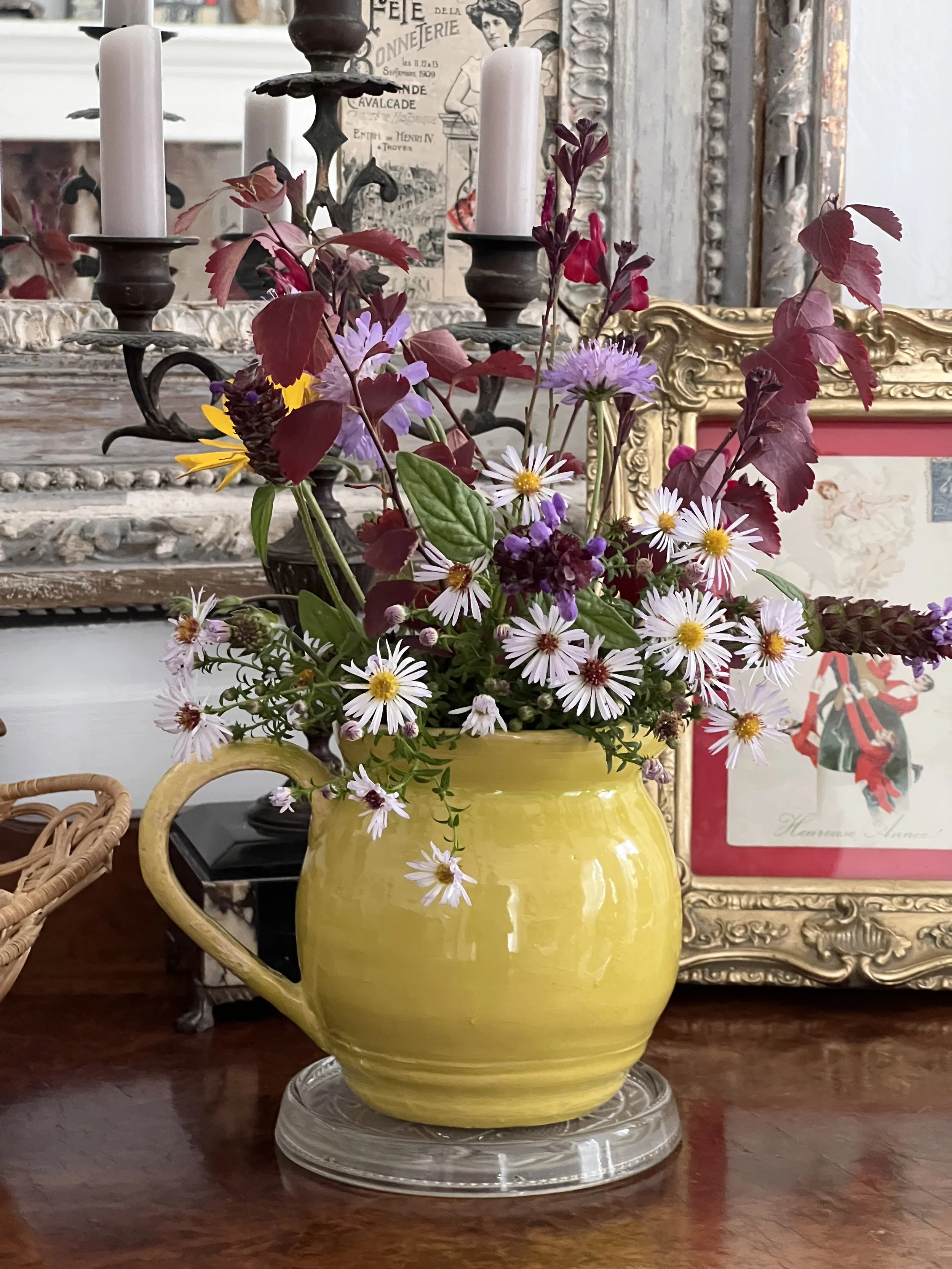 I then made up a little yellow jug of flowers just from the garden. I love the autumn colours coming through in the foliage and the flowers.