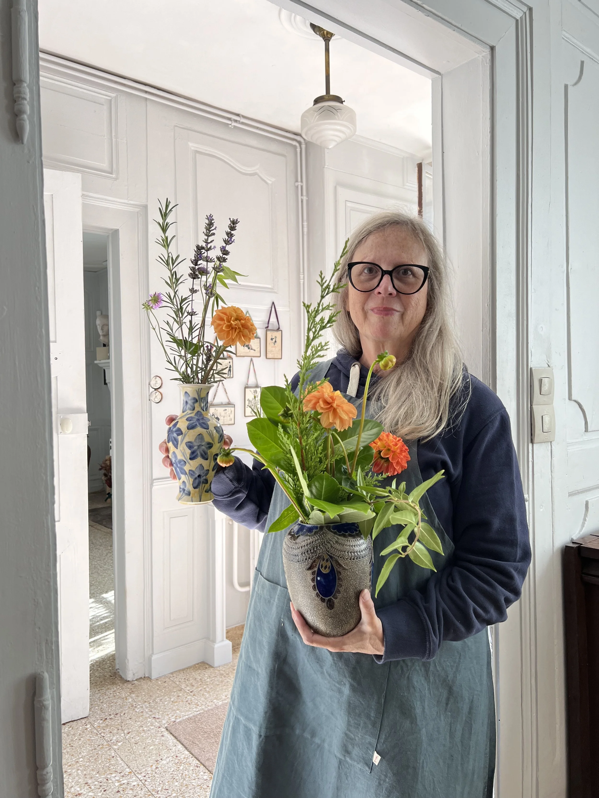 One little last thing to do, before our family arrived, was one of my favourite jobs, preparing the flowers for the rooms. I’d managed to buy some dahlias at the market, although not as many as I’d thought. I need to learn not to leave them behind the stall once I’ve paid for them whilst I go and do the rest of my shopping, as the flower lady seems to get very confused and inadvertently sells them again. Never mind, I had enough, and she refunded me my four euros for the bunch she had resold.