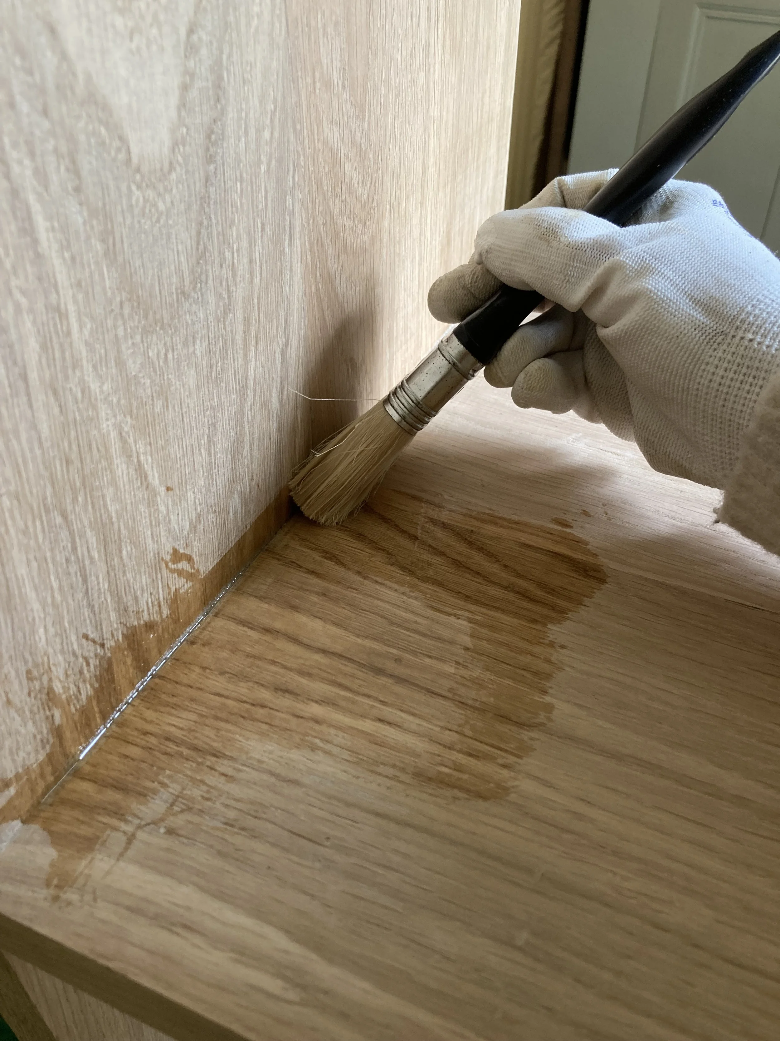 We decided to use linseed oil to protect the shelving and cabinet. It’s a natural product that is used a lot in France to nourish and protect all types of wood, including oak. The only time you wouldn’t use it with oak, is on outside wood.