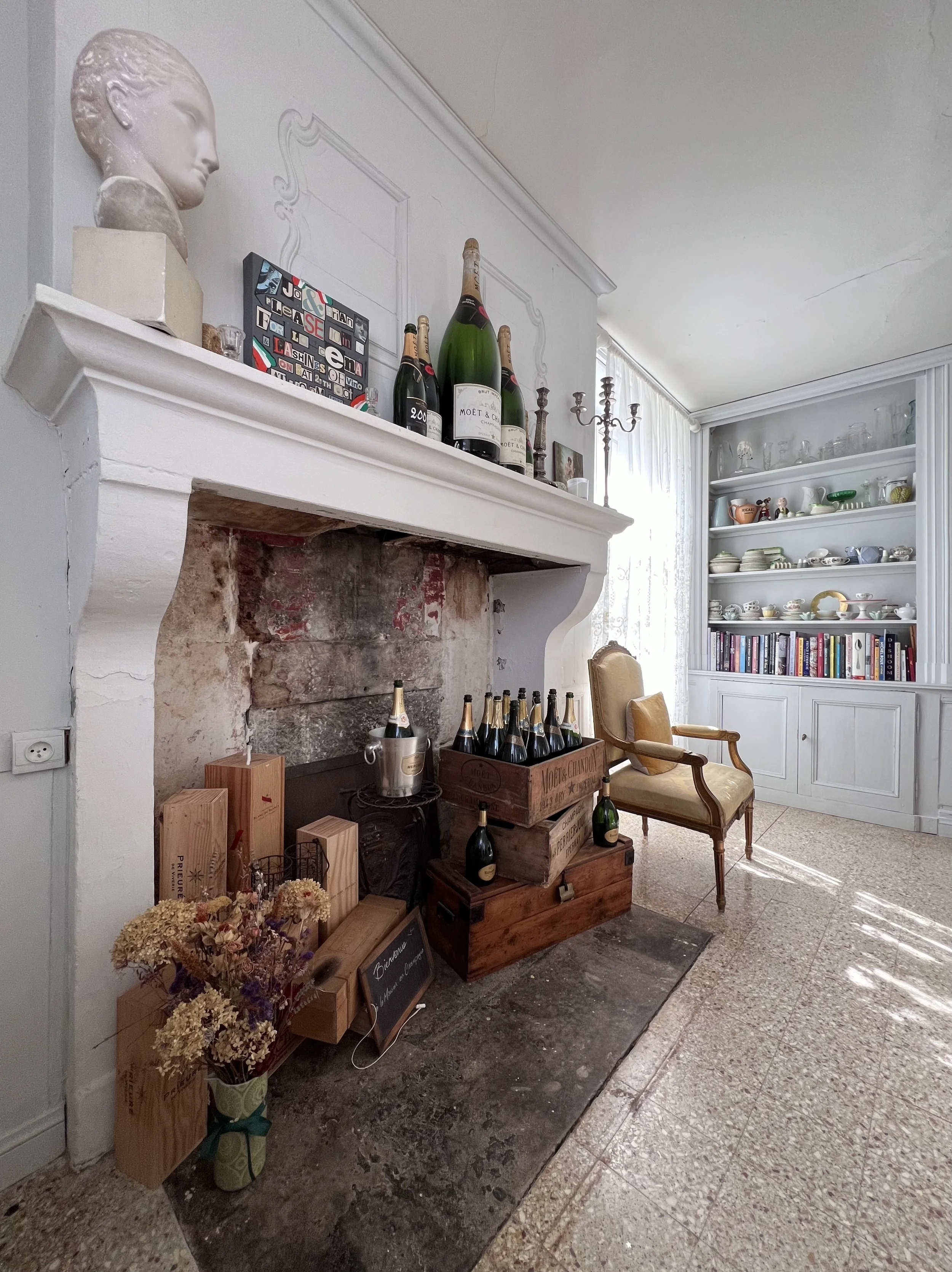 Firstly I asked Brian to help me take the curtains down in the salle à manger so I could get them washed. He then started on cleaning the inside of the windows, whilst I finished a few bits off in the kitchen. I then set us up with some hot soapy water to clean the dresser and its contents. A fiddly job, but a very satisfying one.
