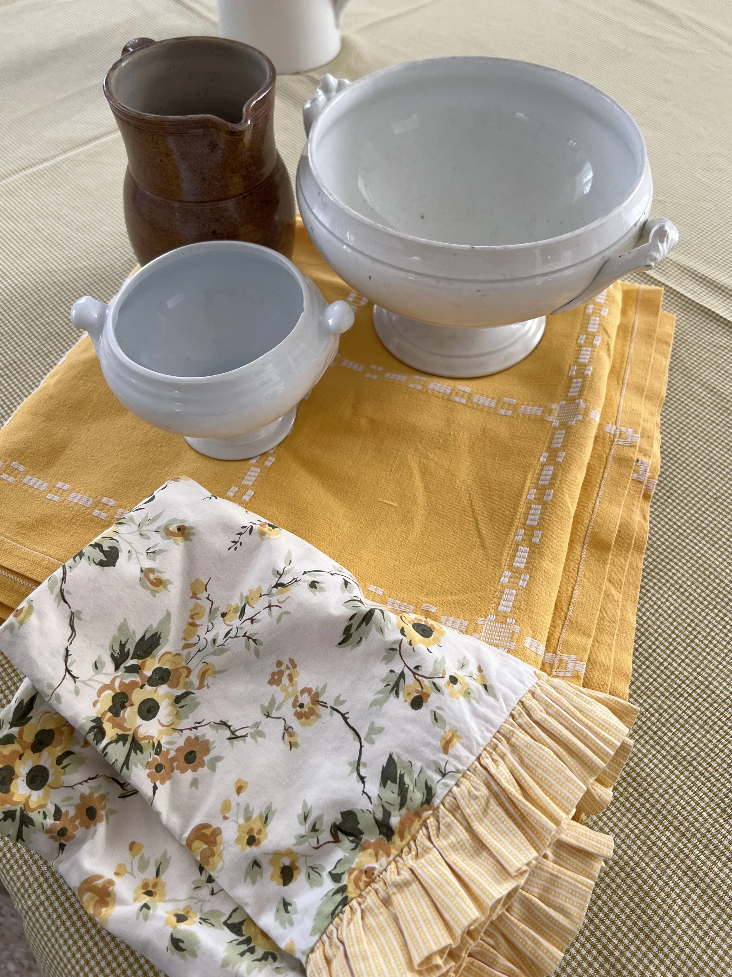 It’s nice to be able to start visiting ‘vide greniers’ and ‘marché des puces’ again. There’s a ‘marché des puces’ (flea market) in Essoyes this week, which I’m very much looking forward to. Last week though we managed to visit two. One of them in the village of Mussy, where we bought 3 beautiful linen tablecloths. I never seem to have enough and I like having different ones to choose from.