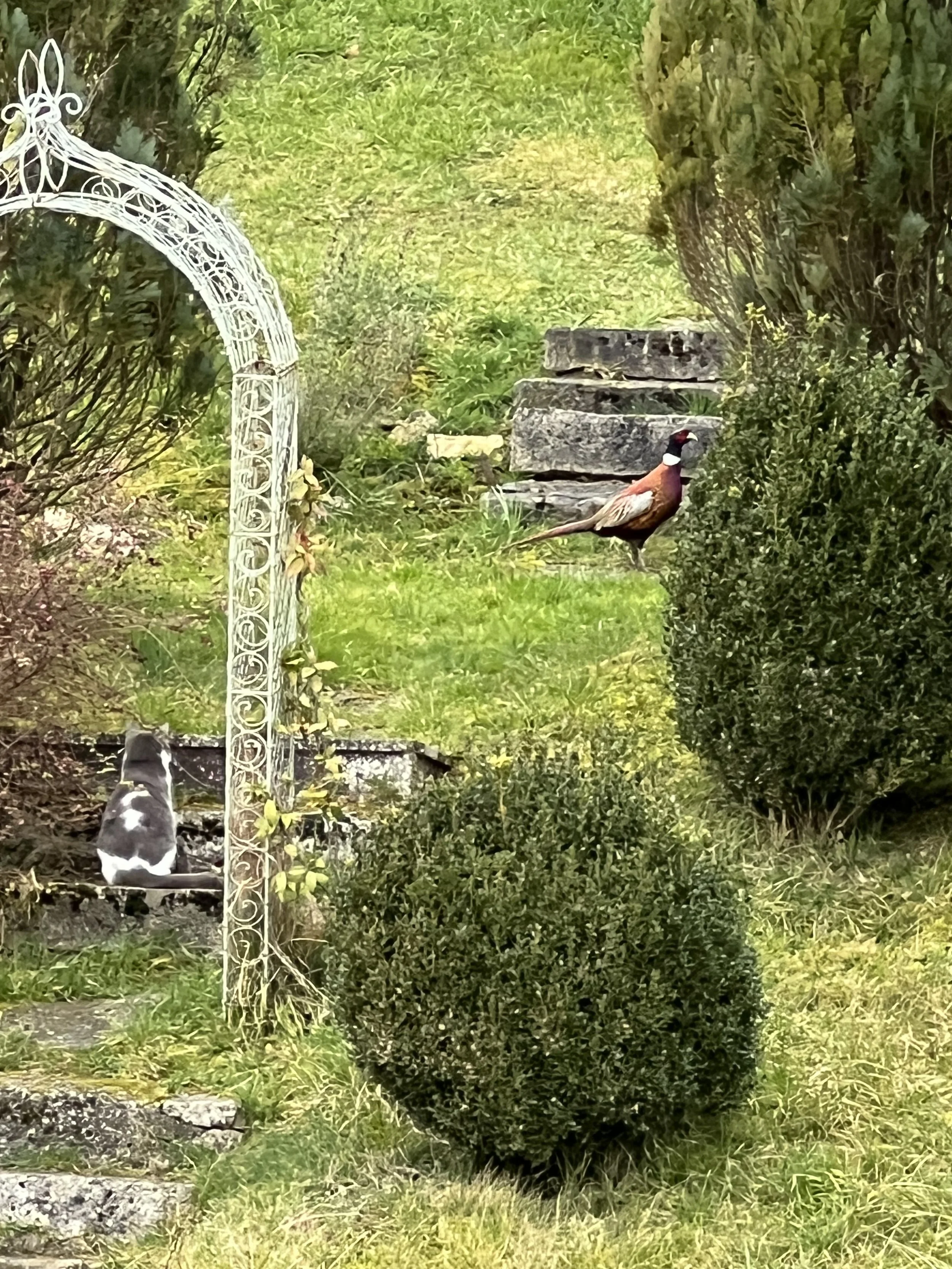 “Ooh!” Brian announced “There’s the neighbours cat creeping out of the trees”. “Little devil” I replied. It was definitely creeping, keeping low and only moving when the pheasant looked away. For a short while we both feared the cat was about to attack, but as it got nearer I think it realised just how big the bird was and its confidence eked away.