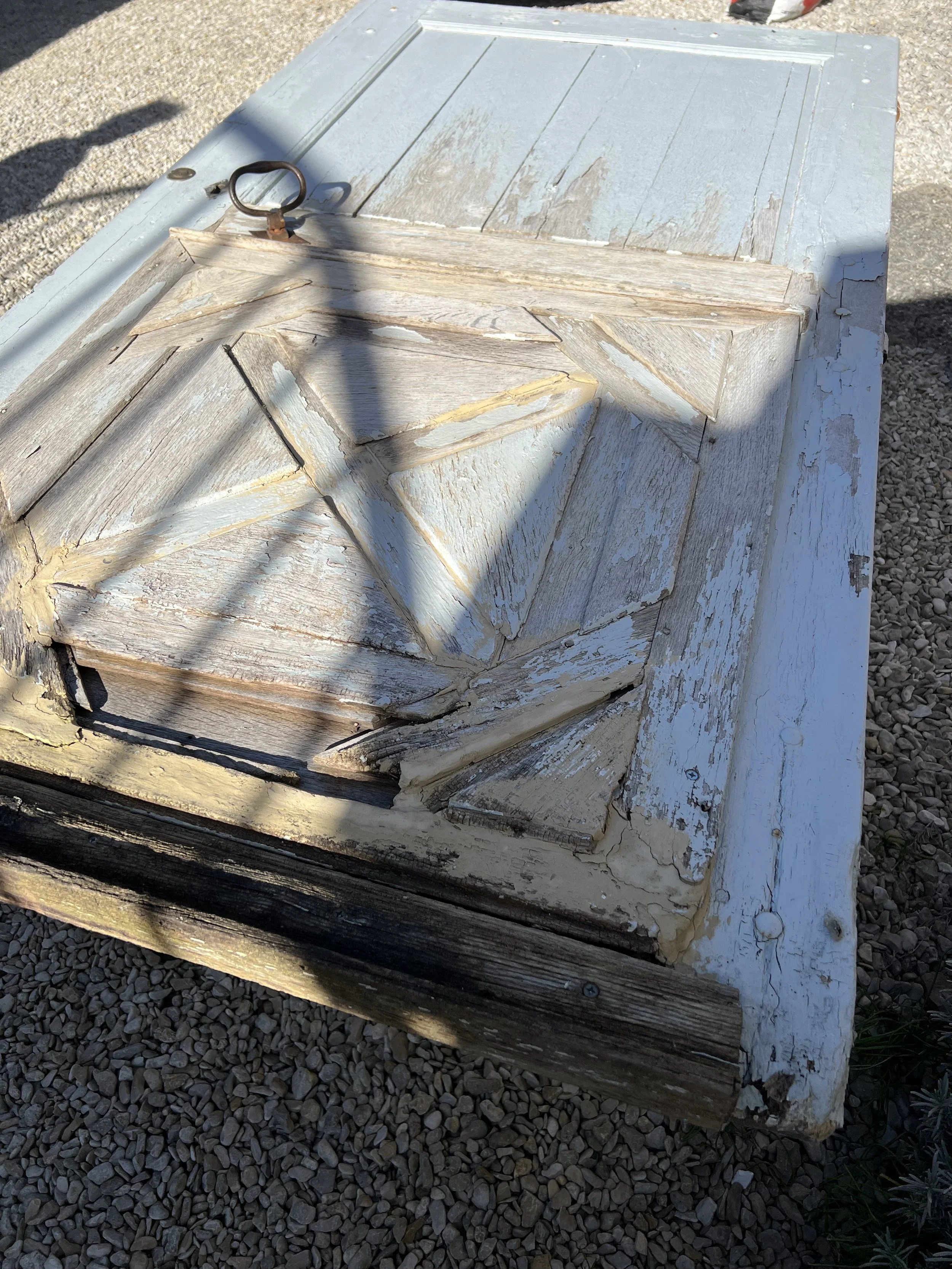 Our small wooden side gate had moved on from looking ‘shabby chic’, and was now looking like it was about to fall apart. It is a very heavy door, so Brian asked Chris, our Workaway, to give him a hand in taking it off its hinges to allow him to work on fixing the missing and rotten pieces of wood.