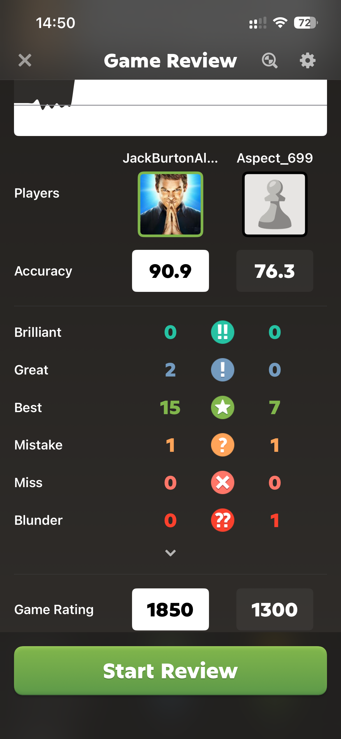 The structured learning, and ability to play against other people around the world, was exactly what he needed. He started with an ELO (which is a Chess rating system) of 400, but quickly dropped down. After some effort, he worked his way up to 1200, which is apparently considered okay for club Chess. But his latest game cheered him the most. Although his overall rating was still only 1276, the computer rated his play at 1850, which is considered strong club level.