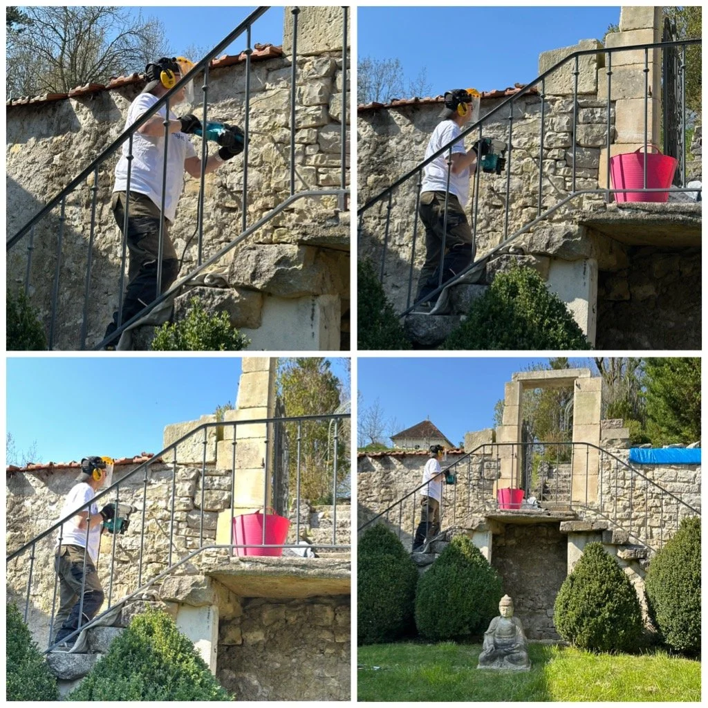 With a little encouragement from a friend, we decided the stone wall to the left of the steps needs the concrete chipping off, and the pointing replaced with chaux. It will be so much more in keeping with the wall on the right that they did last year.