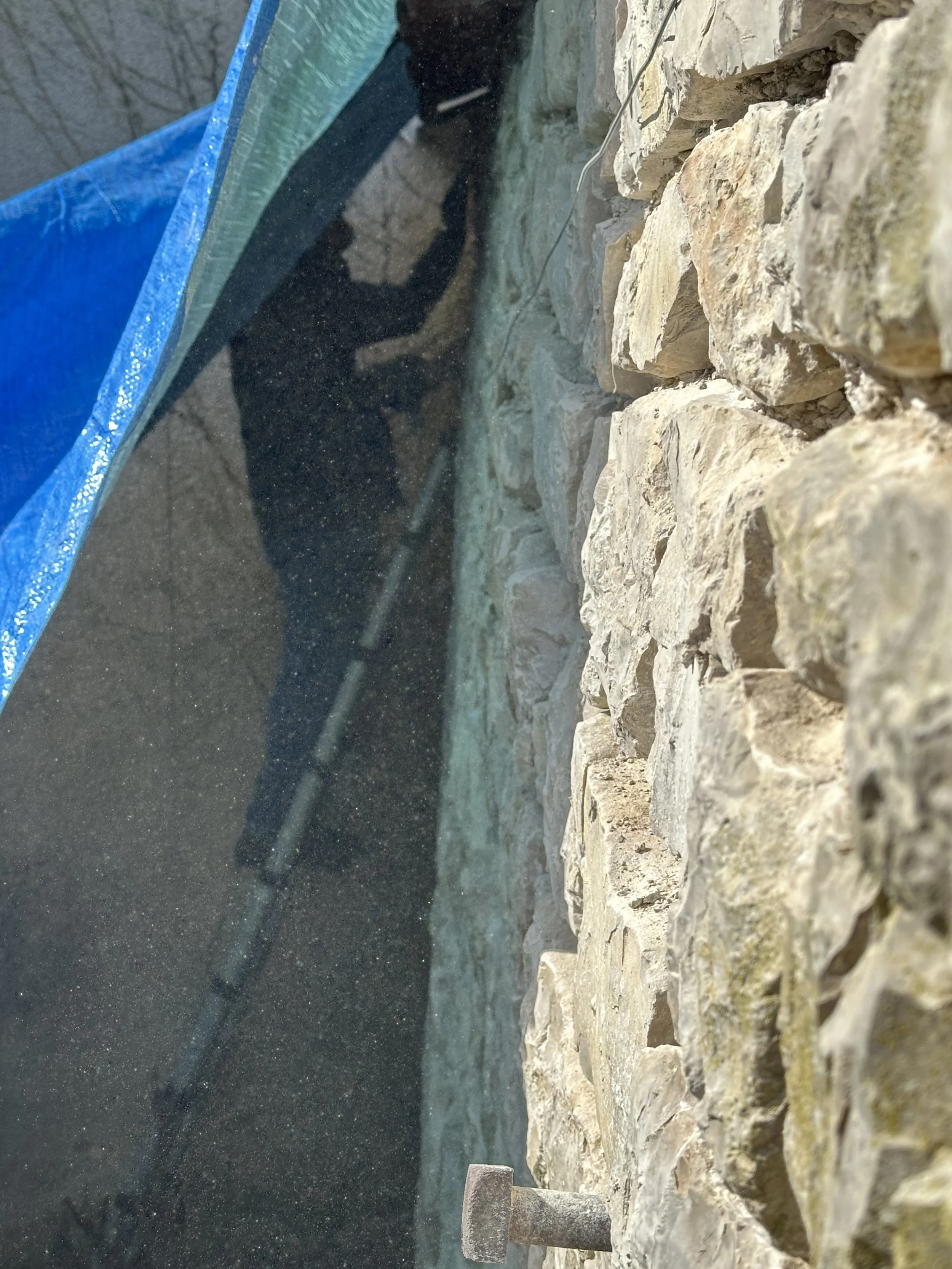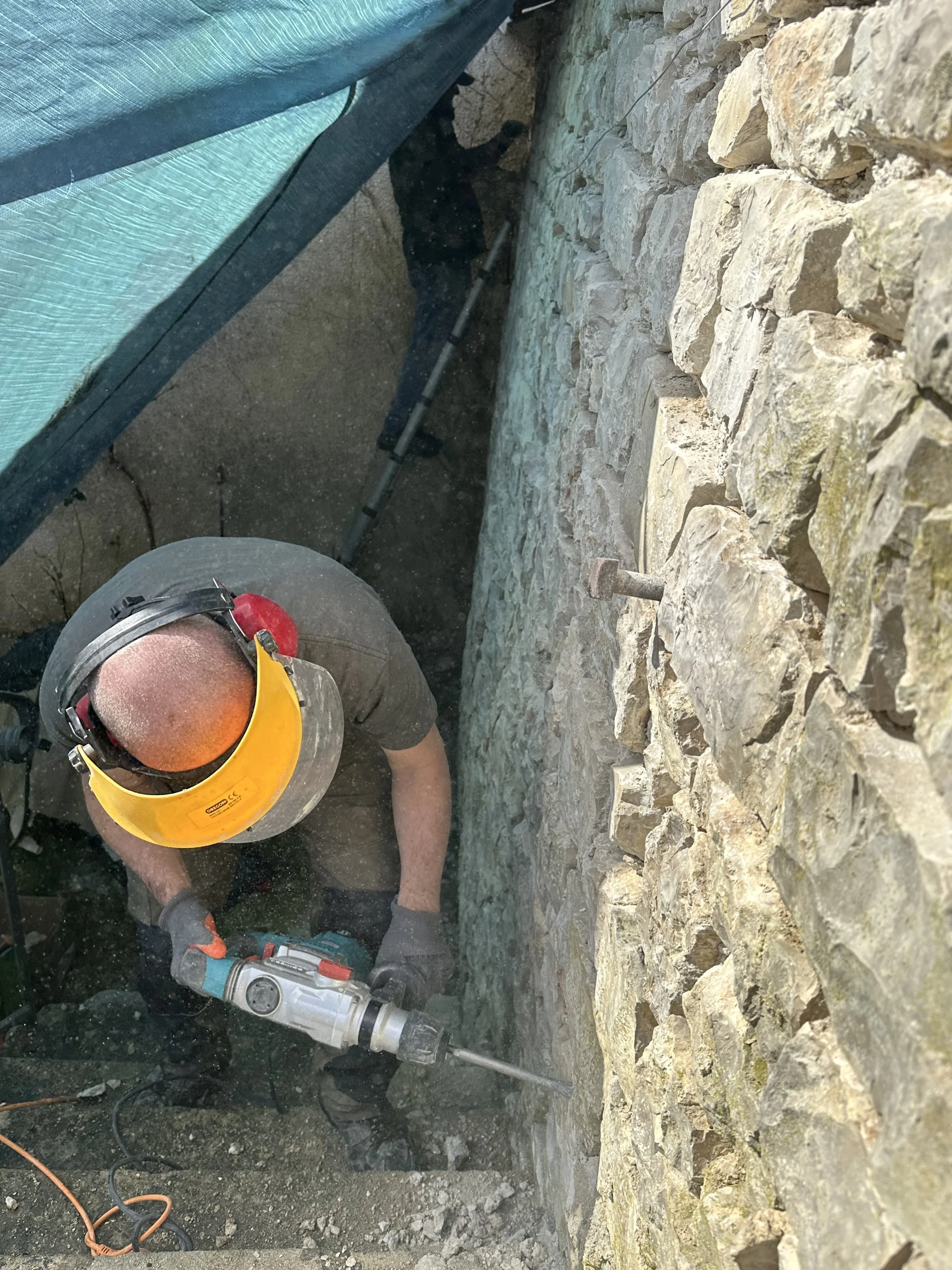 Brian kept the chaux mixed up for Chris, and spent a little more time just cleaning up some of the gaps he’d maybe missed on his first pass with the hammer drill.