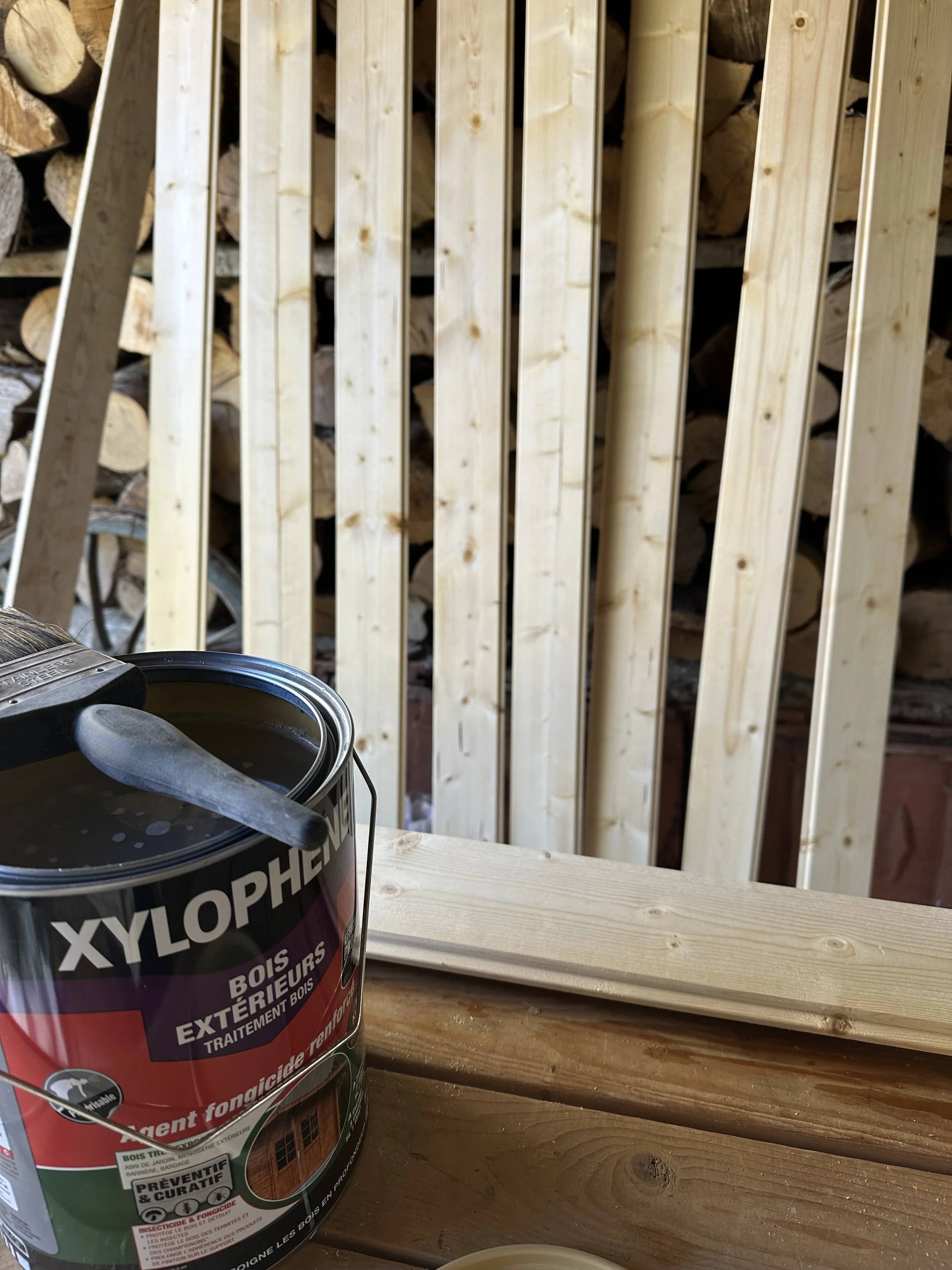 Sara and I were on wood protection. The wood for the shed was untreated, so we needed to get a coat of exterior treatment on it, before our other friends Philip and Jillian arrived to help put it up.