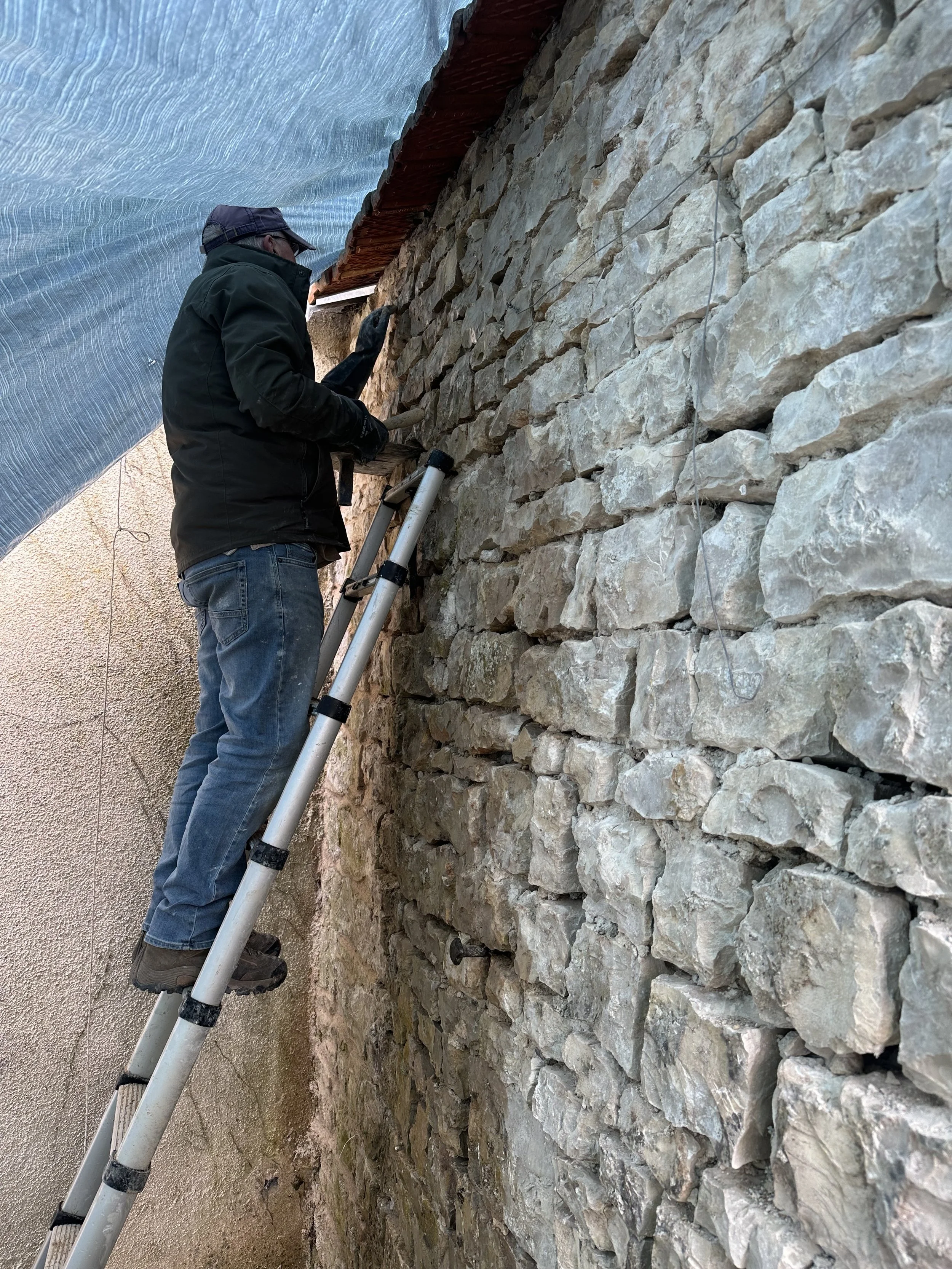 The day started with Brian getting the chaux mixed up and Chris tucking himself away under the tarpaulin and starting to point the wall. The sun was shining, but it was bitterly cold, and we knew the forecast today was very changeable.