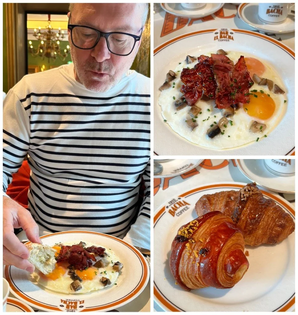 They were worth waiting for; three fried eggs with bacon and mushrooms, followed by a choice of two croissants each from their menu. Yummy.