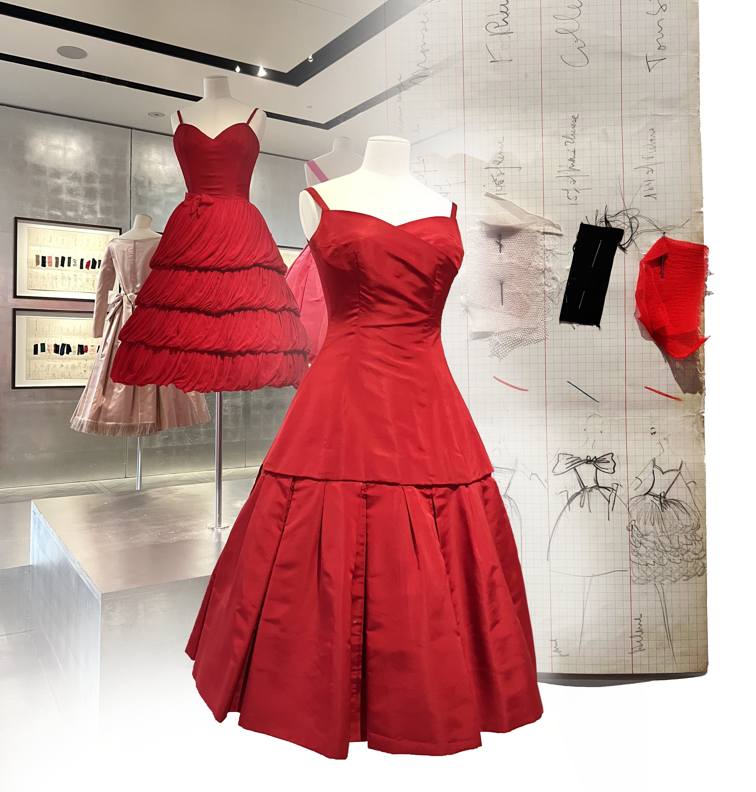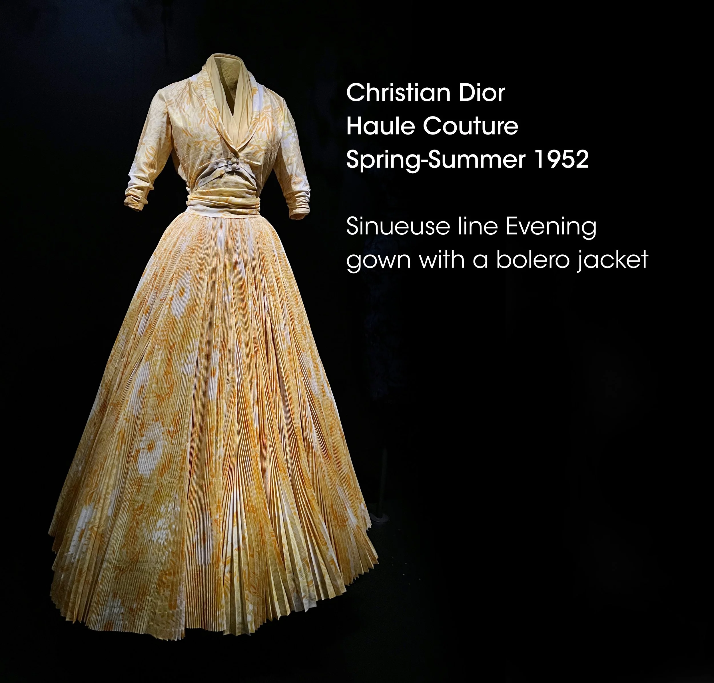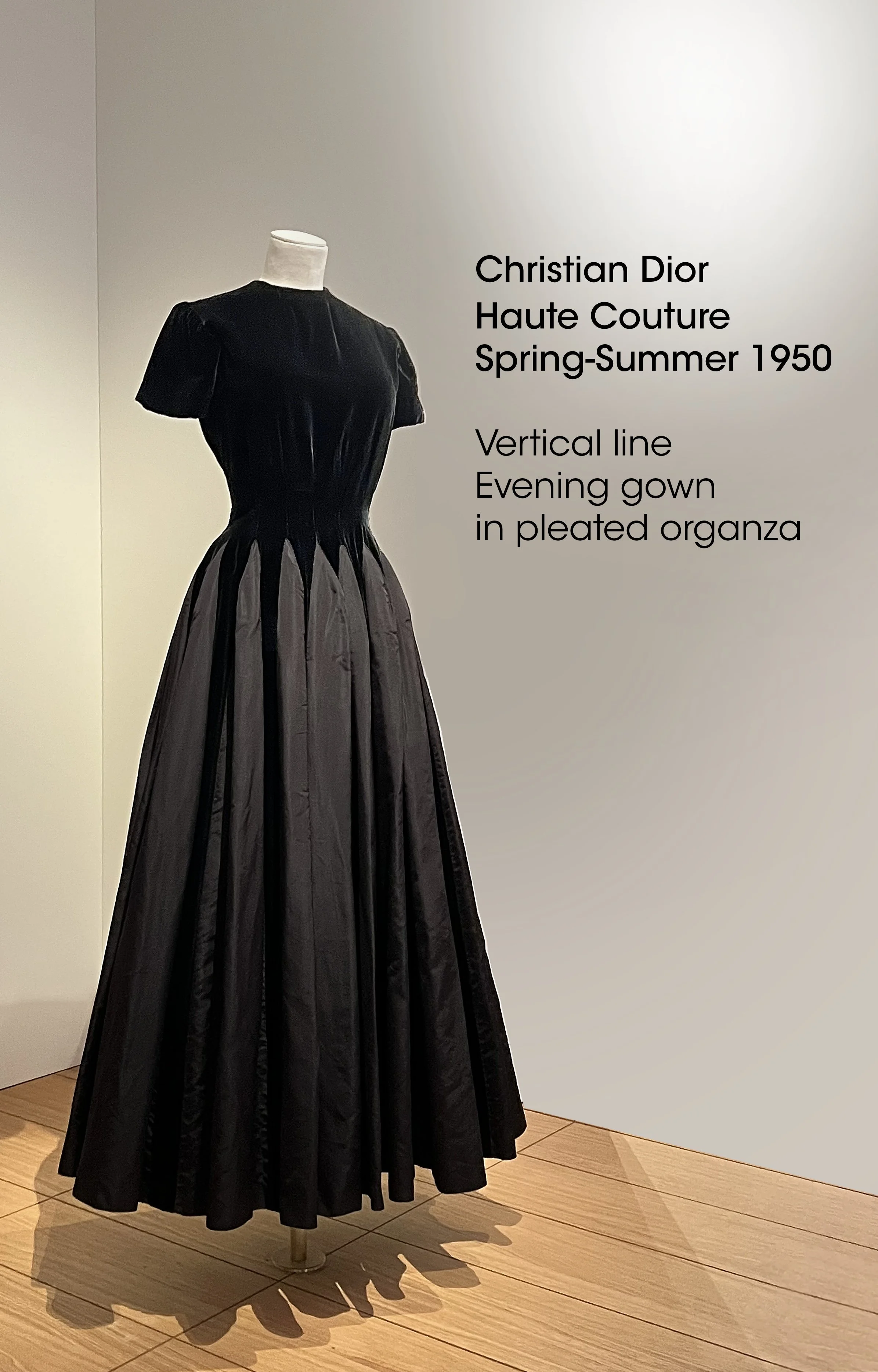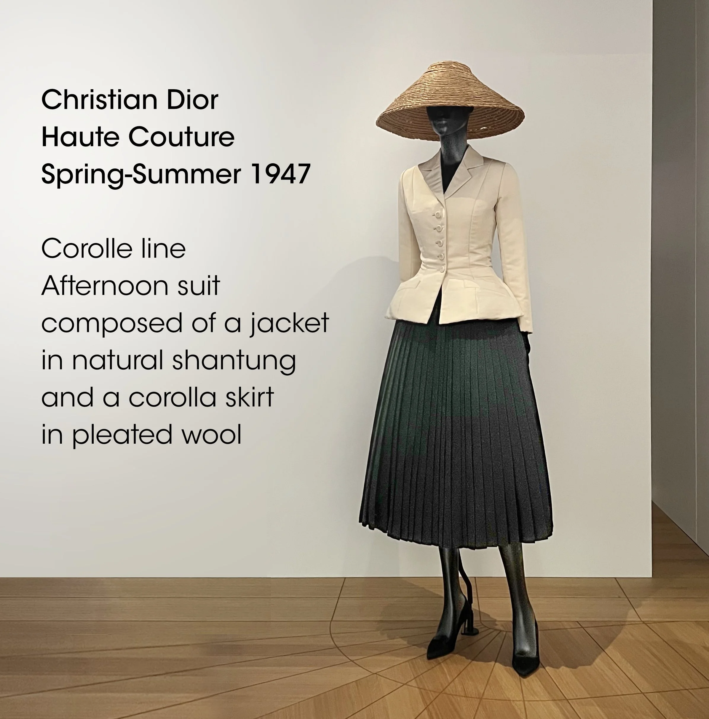 The exhibitions timeline begins just after the war. The first Christian Dior collection was launched in the Spring–Summer of 1947, from the salons of 30 Avenue Montaigne. Now two years after the end of WW2, he named the new lines ‘Corolle’, and they were pretty striking, with their feminine lines, fuller skirts and luxurious fabrics. He was leaving the restrictions of war fashion behind, and designing clothes with fuller skirts and longer lines, using more yardage of material. it instantly drew a response;