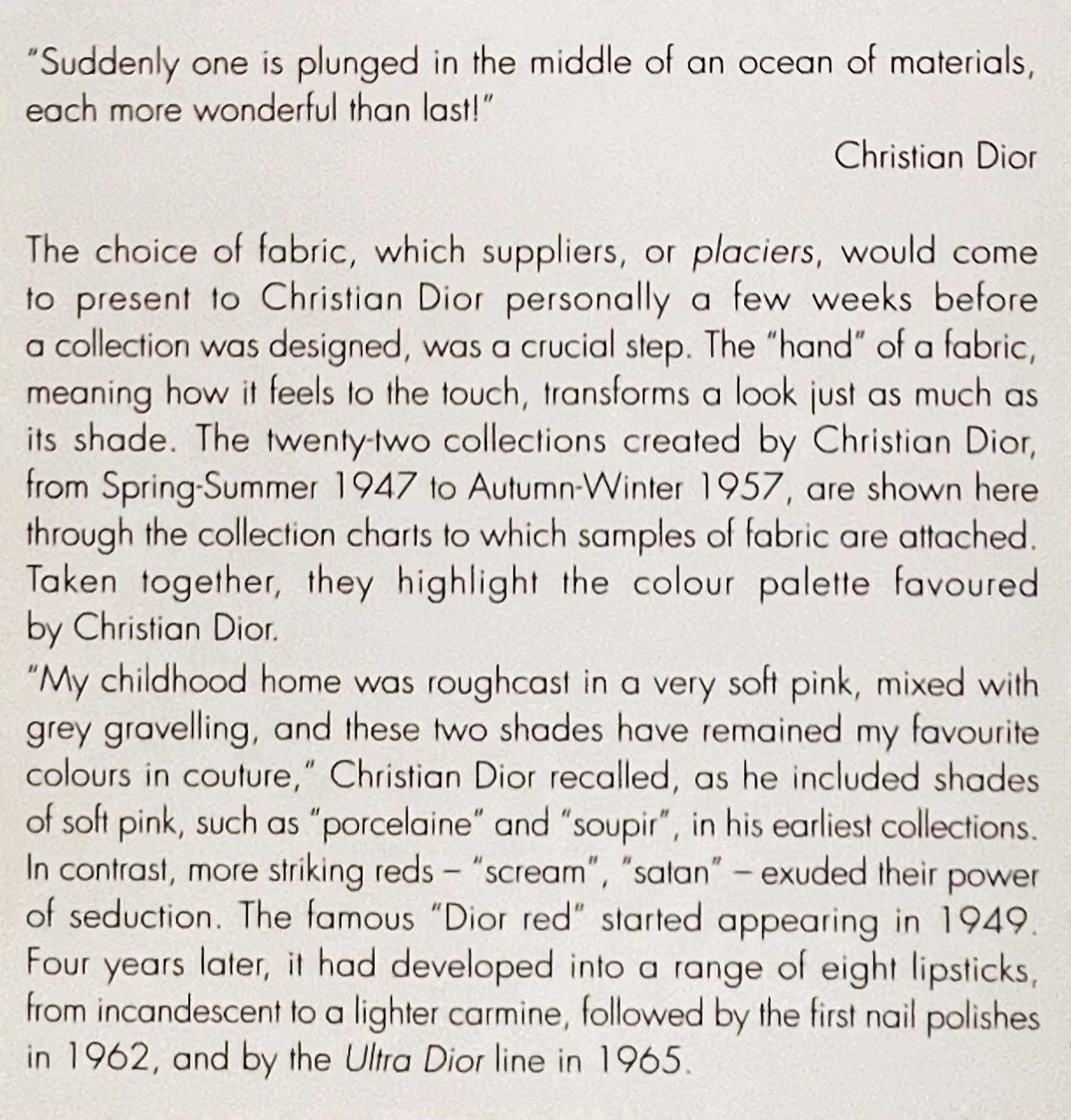 Up to now the exhibition had been quite muted, and I love a bright colour, so I found the next room really exciting. The most beautiful red dresses, and the designs behind them. It was fascinating to see his inspiration coming together on paper, with his briefing notes for his teams. He would make a sketch of the dress, attach a sample of the materials he wanted used, and give it a small description. It was enough for his team to understand what he wanted, he must have been an excellent communicator.
