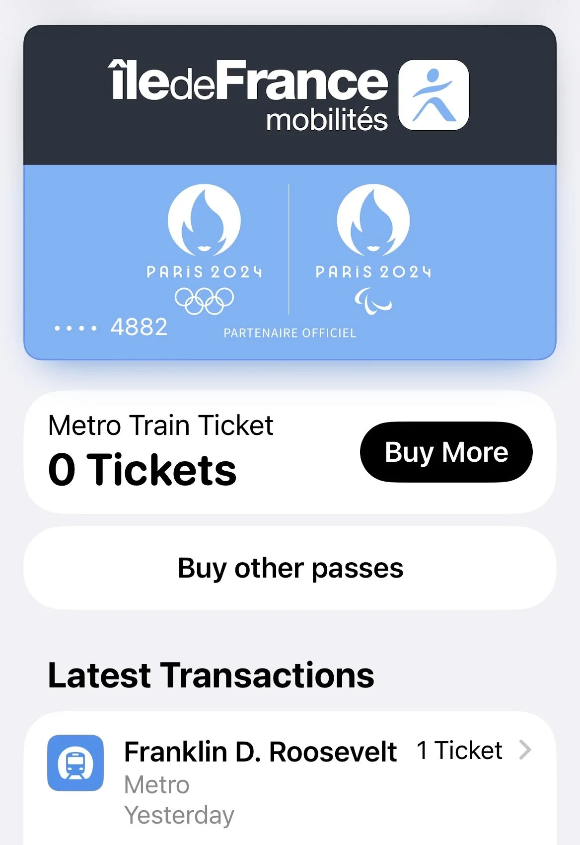 A friend had recommended we set ourselves up with an Île-de-France mobility card, this can be used on buses or trains. We uploaded it onto our phones, and set up a payment card. We bought a ticket to Franklin D.Roosevelt station. It all seemed very simple.