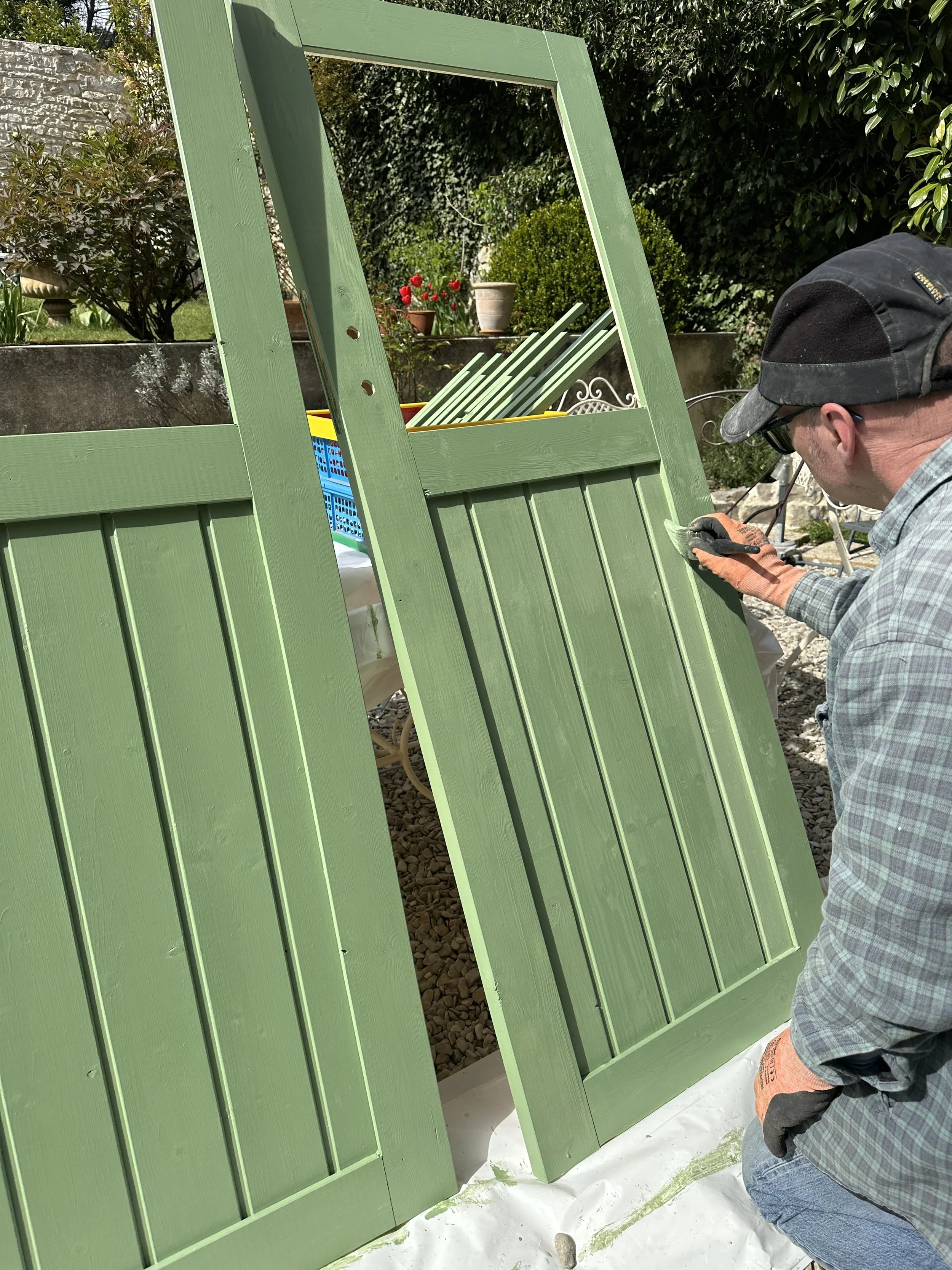 We woke to glorious sunshine, so straight after breakfast Brian was outside putting the second coat on the doors.
