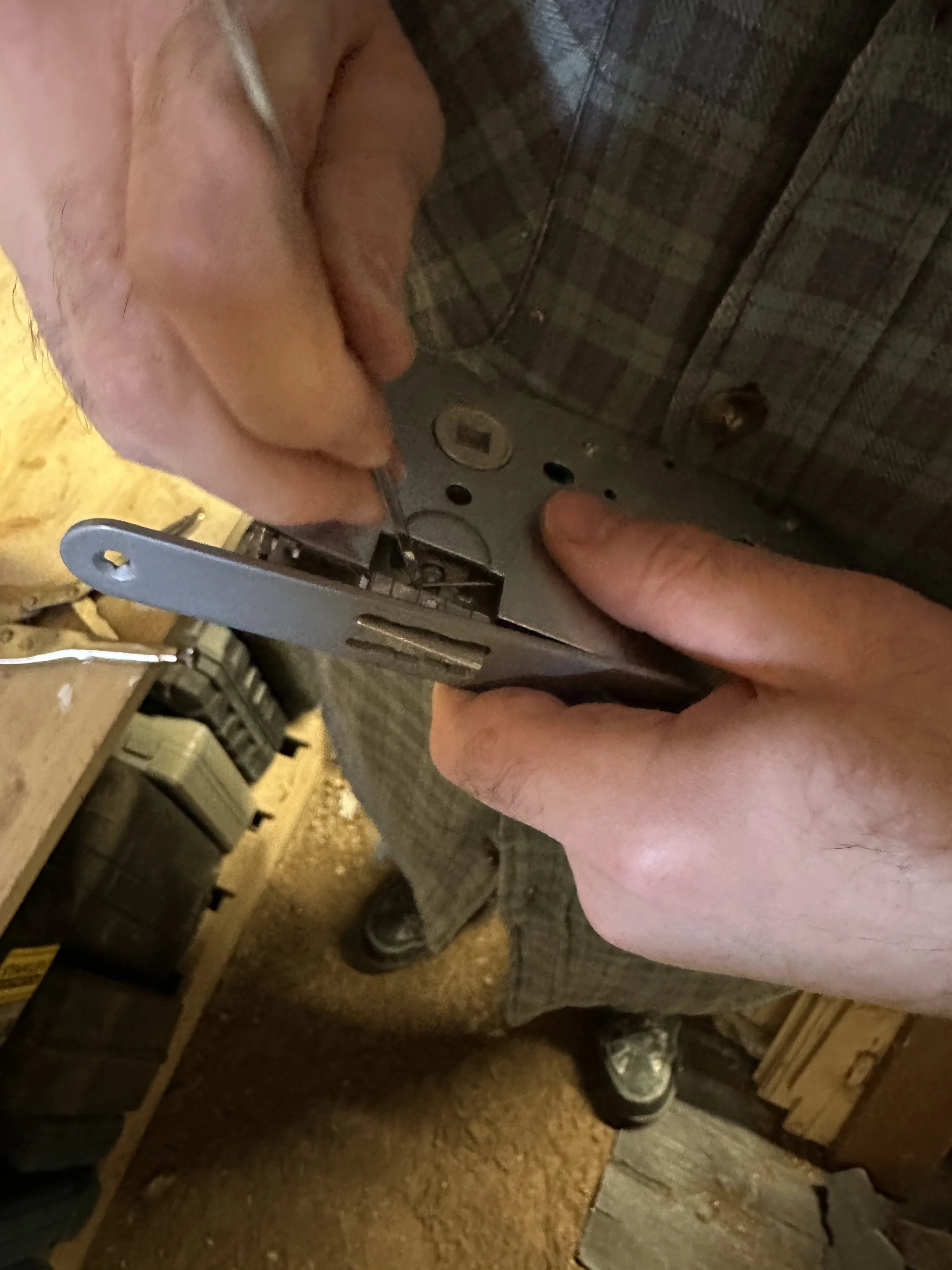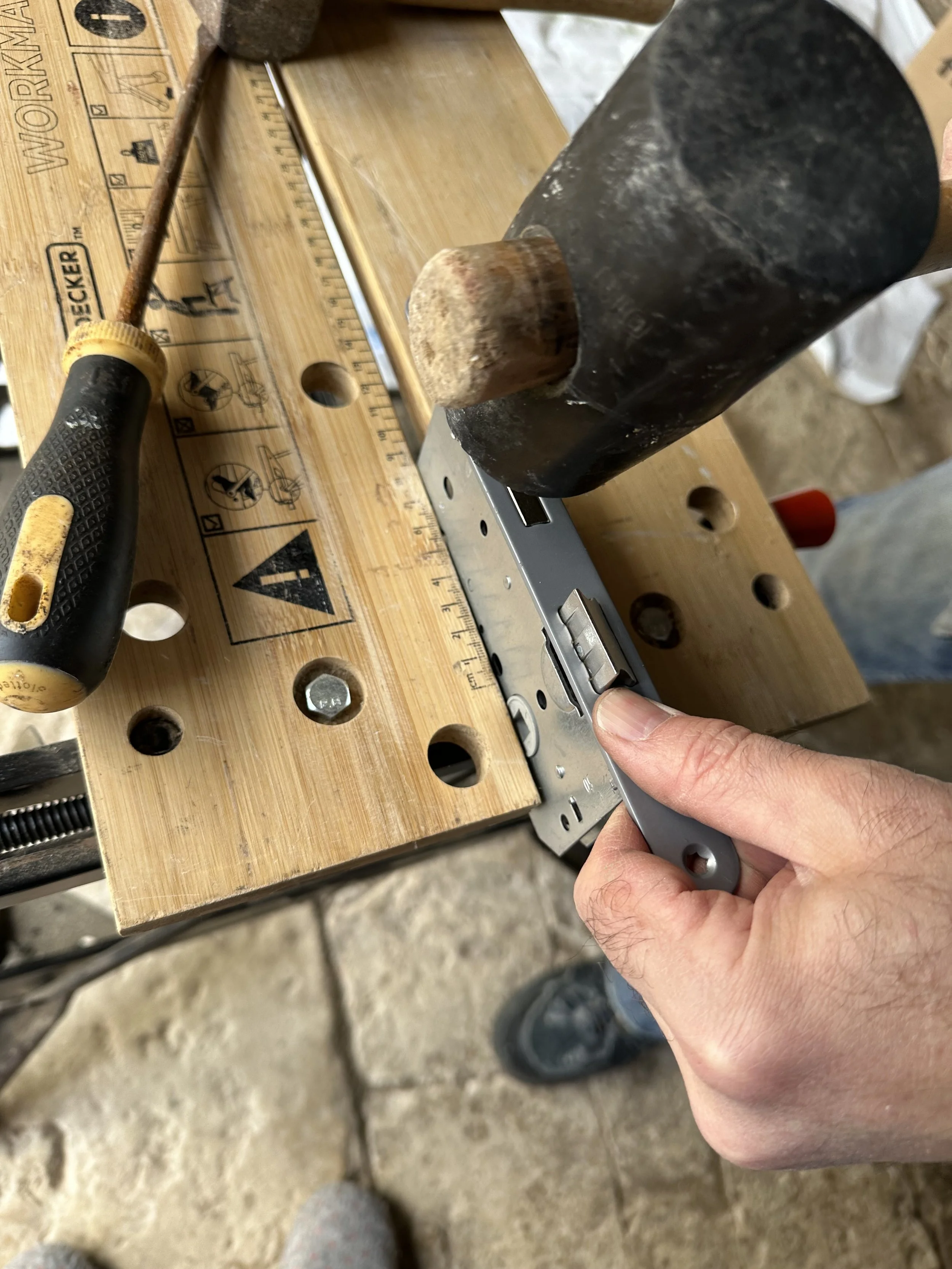 He soon realised that the door handle latch was the wrong way round for the doors. Normally you would find a couple of screws you can unscrew and turn the latch around. But this door handle had tiny clips that had been fixed into place, that were not designed to be removed. This wasn’t going to stop Brian, he got a pair of pliers and proceeded to man handle the lock apart. A few expletives later the lock had given in, and he could swivel the latch to face the other way.