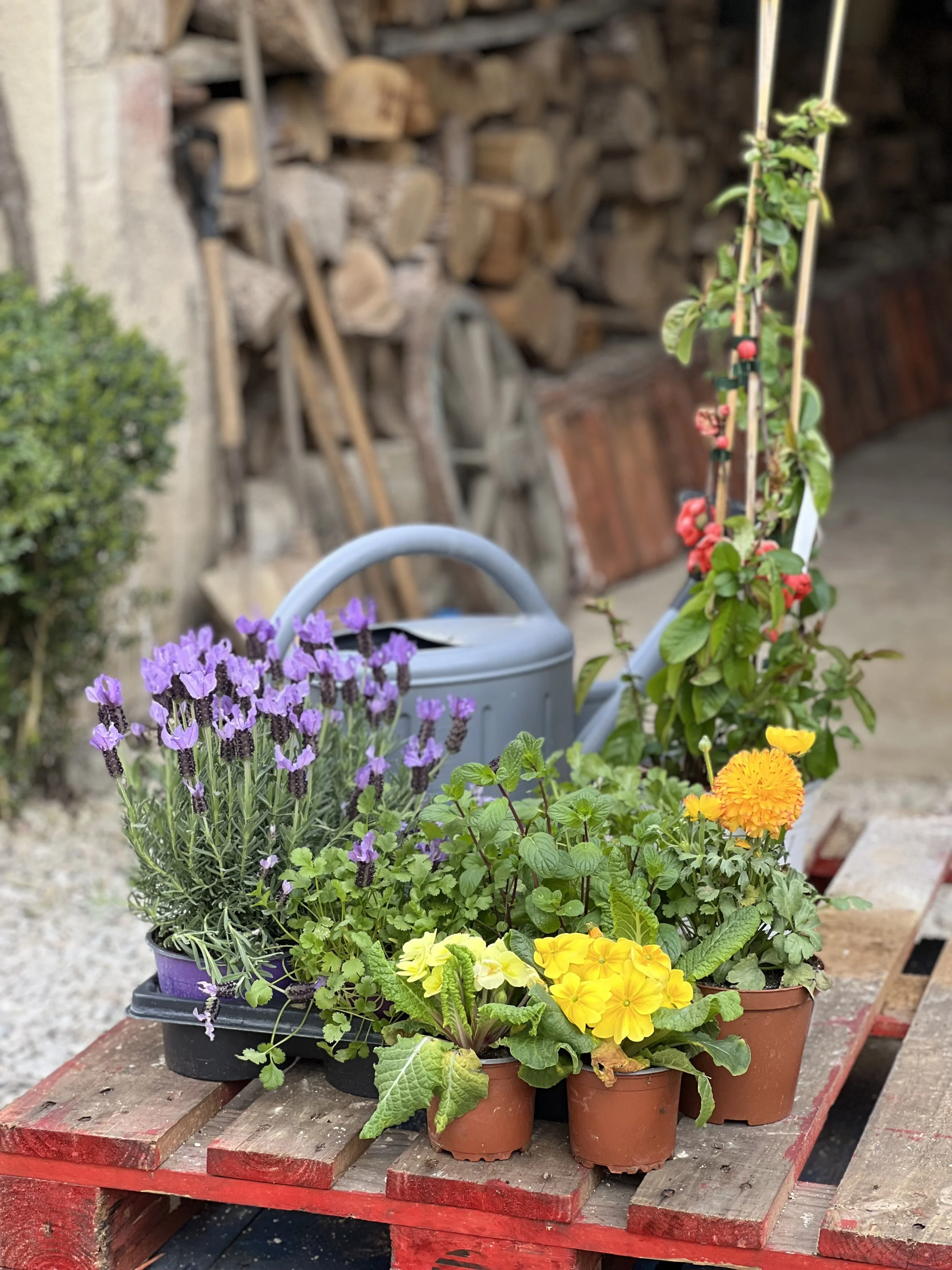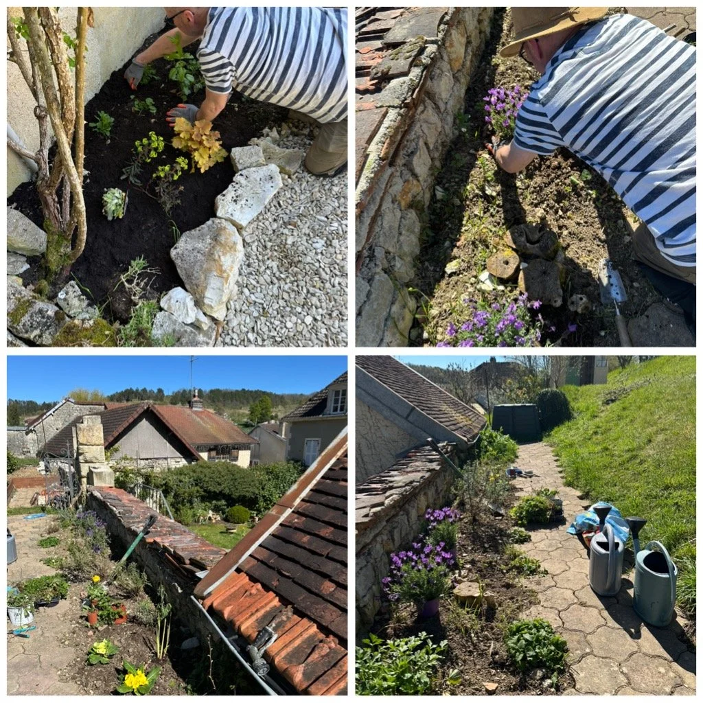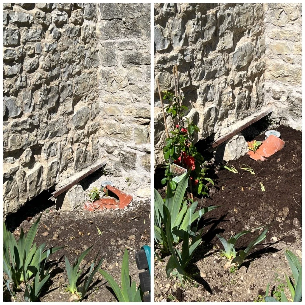 A quick clear up of the chaux, a dig in of some compost, (careful not to damage the little honeysuckle I’d planted there last year) and a replant of some irises and it looked a lot better again. We also planted a Camillia which I’d bought recently. I think the bright pink flowers will look beautiful against the newly chauxed white wall. A white rose grew on this wall, which had to be cut down pretty hard when they chauxed it last year, and it’s showing some strong signs of life, so I’m hopeful it will be okay.