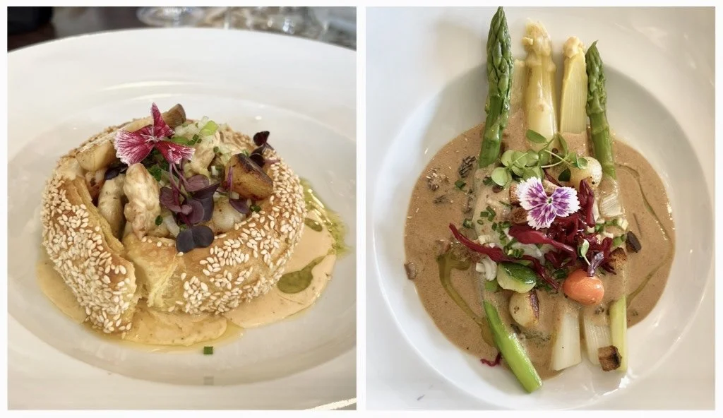 Then came our starters: I had the asparagus in morilles cream, and Brian had the vol au vent with sweetbreads. Both lovely.