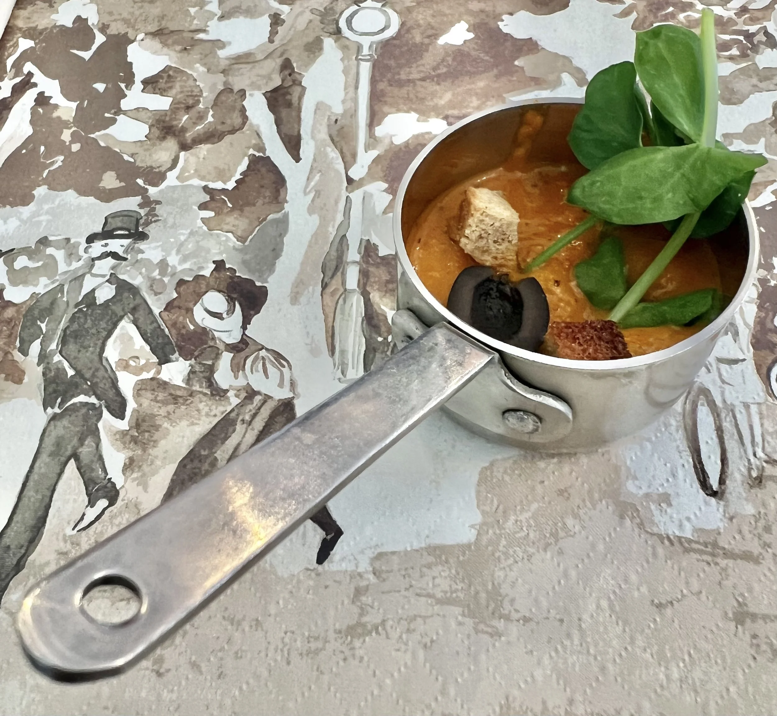 First up was a little amuse bouche: a tomato and pepper gazpacho. Very tasty.