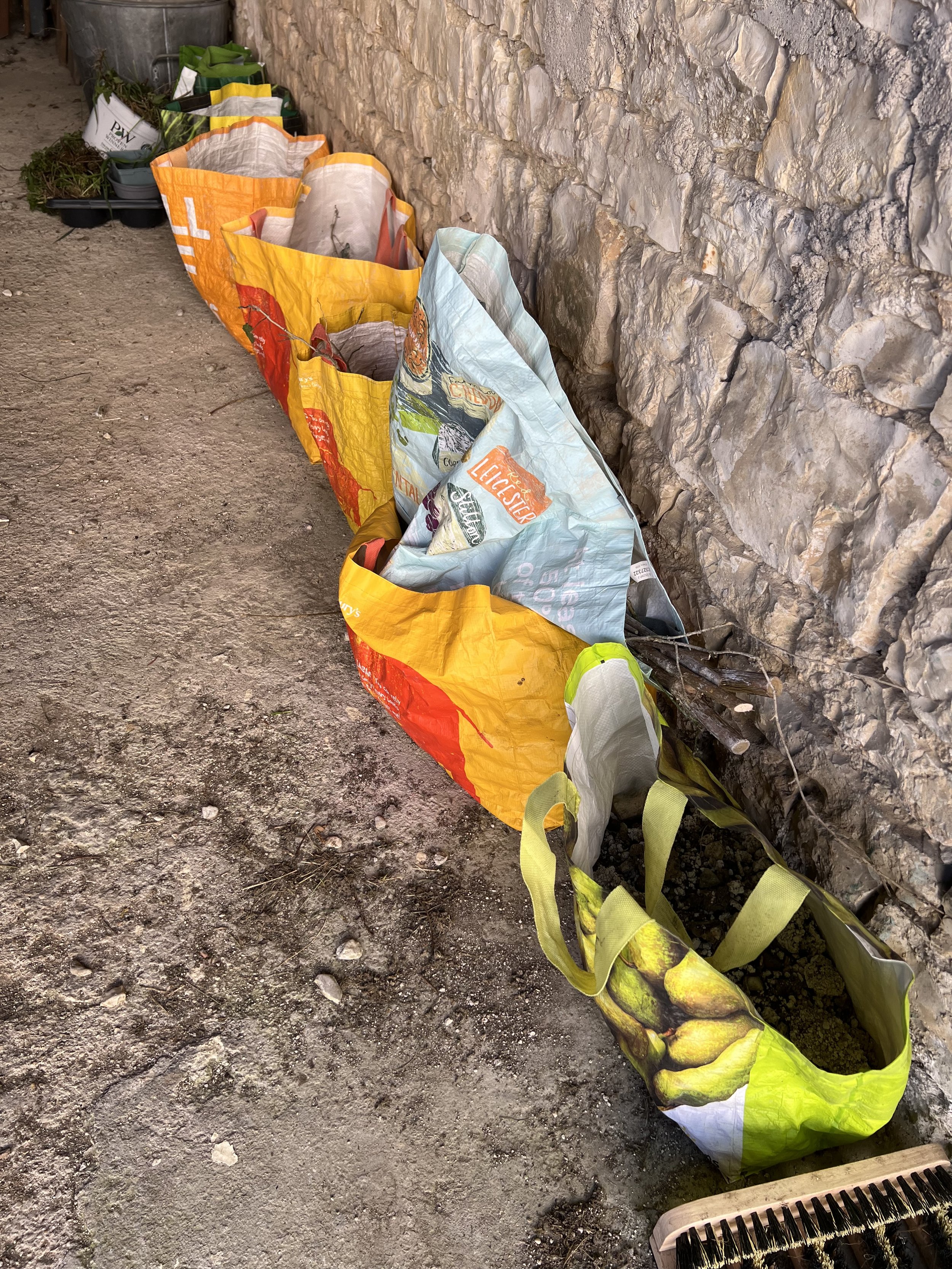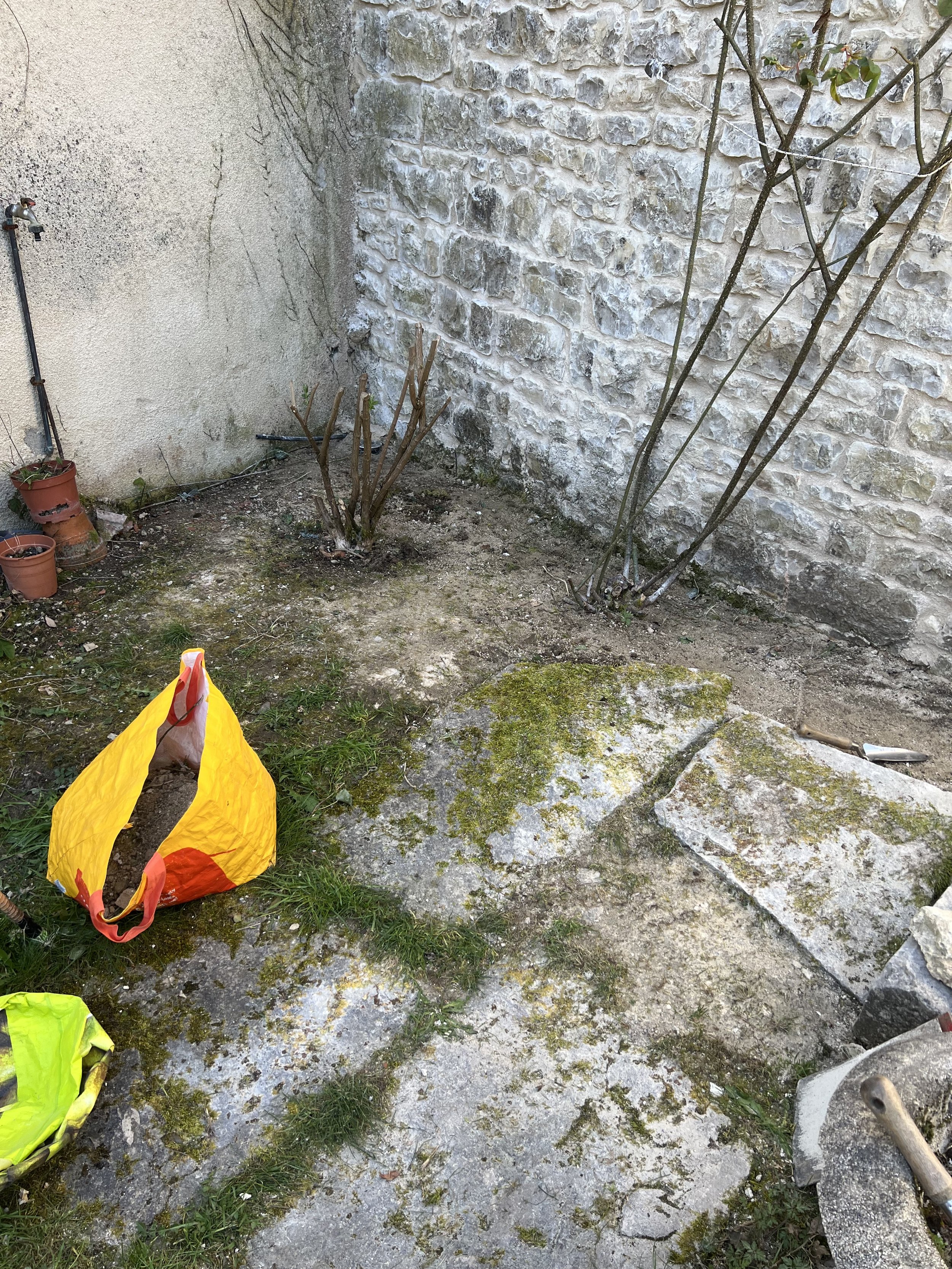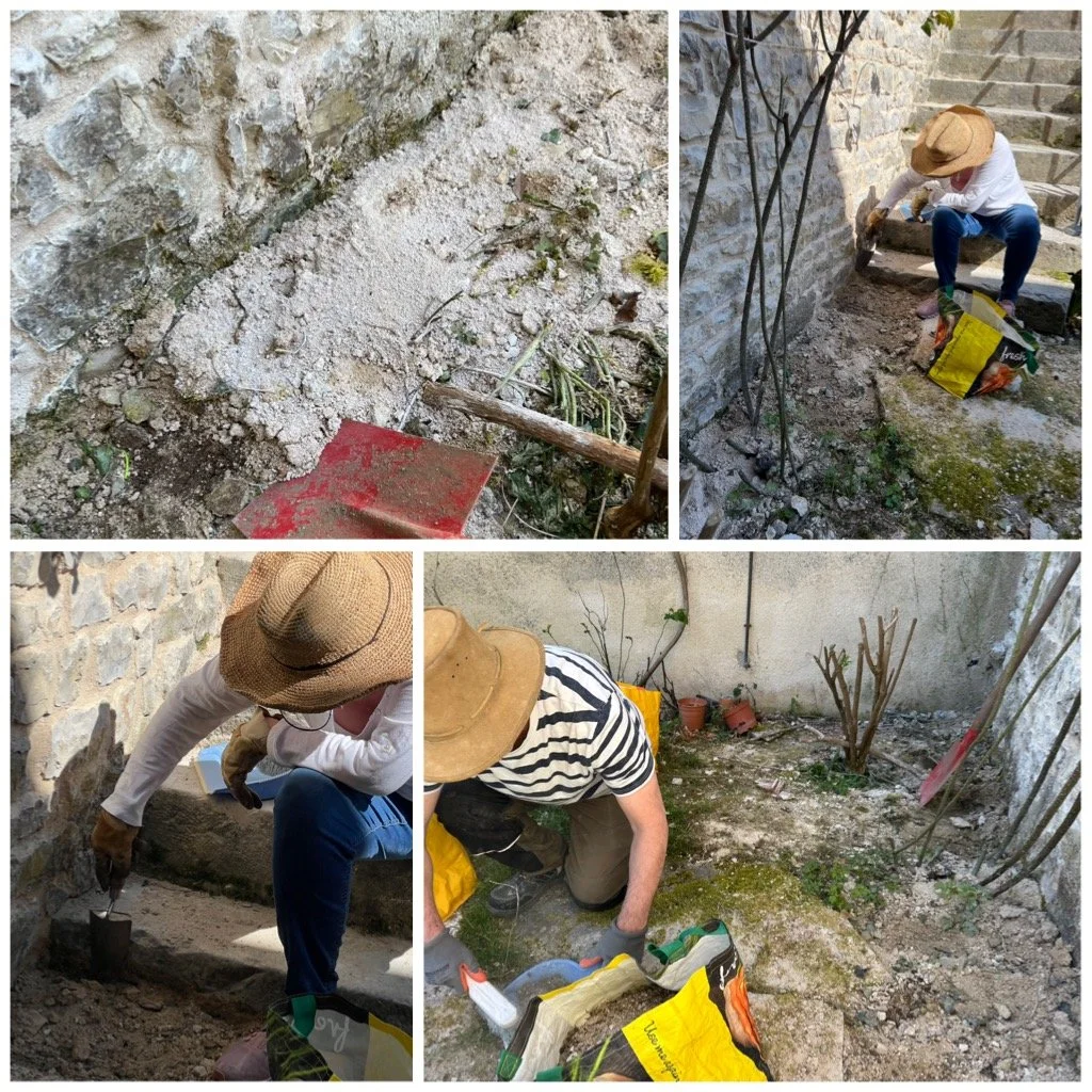 The thing with using chaux is it gets everywhere, and the plants do not react well to the lime, so I was keen to clear up the dropped chaux along the wall as soon as we could.