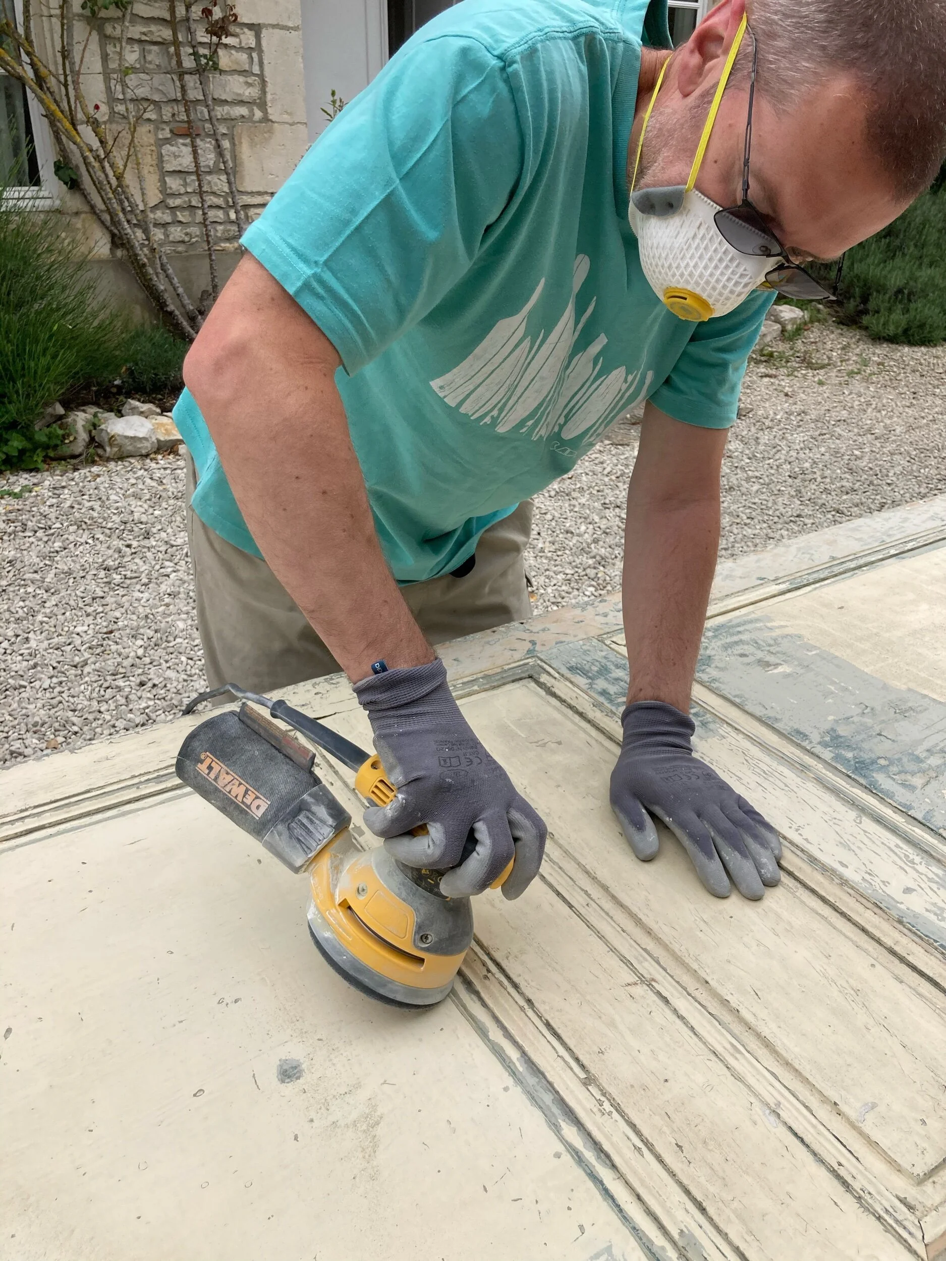 Today whilst I was plodding on with the grouting Brian was outside preparing the old door he had found in the barn which he wants to use for the entrance door into the atelier. We were not keen to remove all the old paint, just where it was flaking. I love the layers of colours through the ages that start to appear.