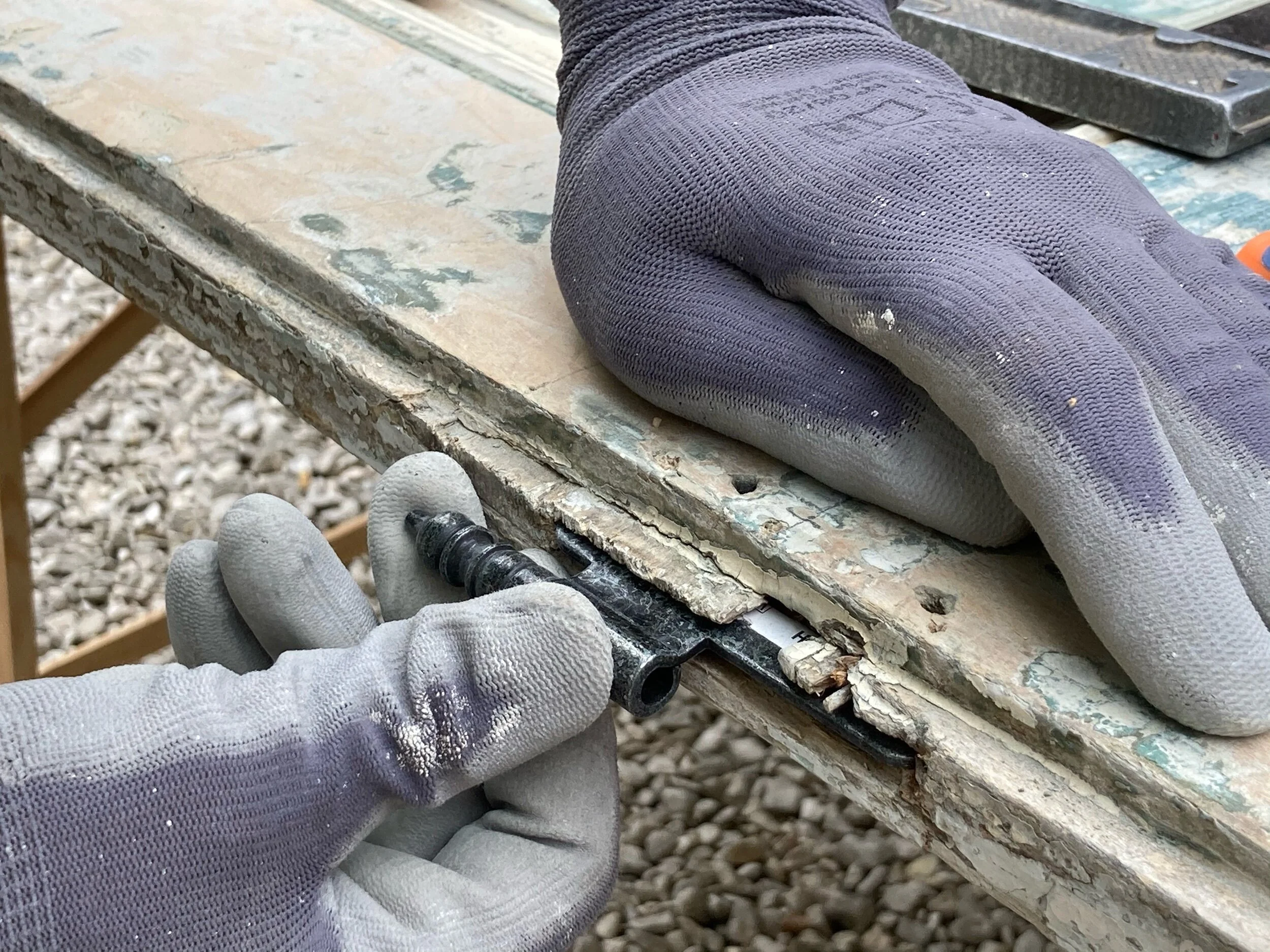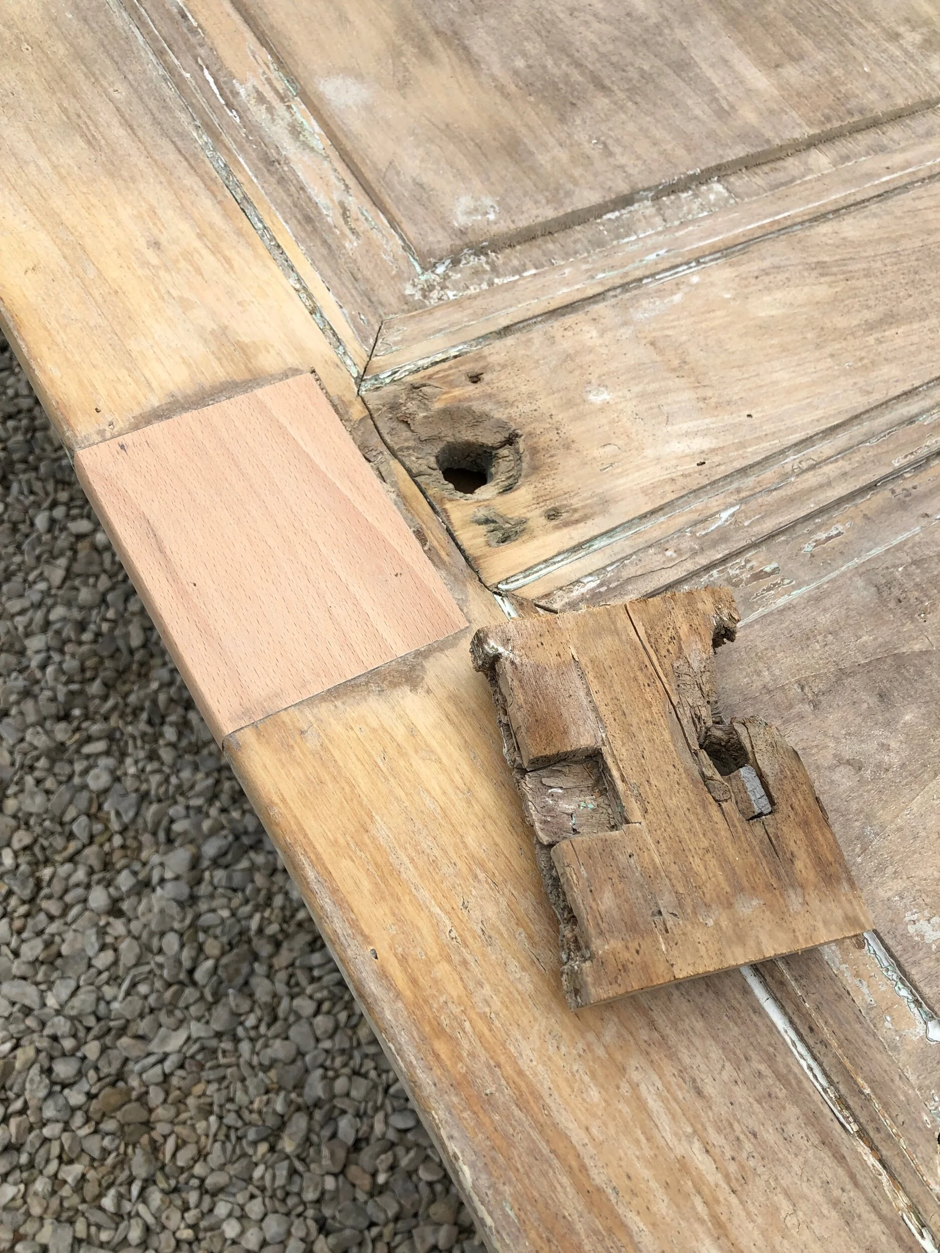 He then needed to cut in a new piece of wood to strengthen where the lock and handle will go. And also fit three french style hinges to it. One half of these slot into the wooden door, the other half are screwed to the door frame. Then they slot into each other. Sounds easy enough!