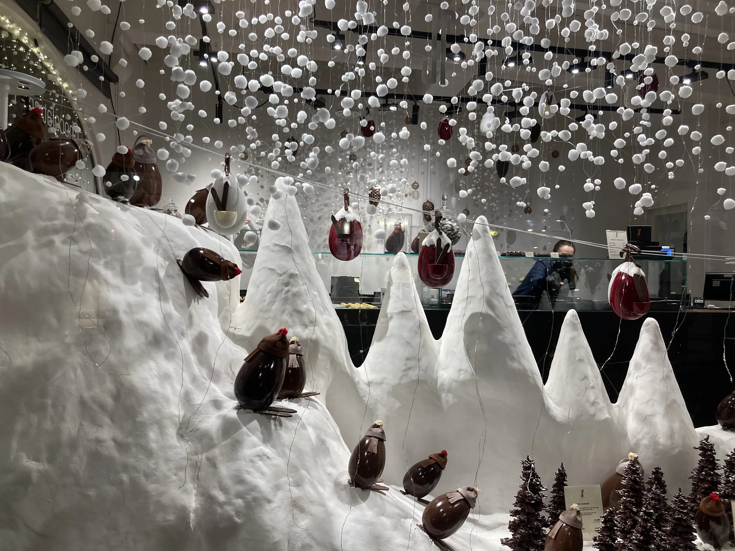 A chocolate shop with its darling little egg-like figures on skis, and egg shaped cable cars stretching across the scene. Hundreds of little cotton balls were hung on wire to depict the snow. Truly adorable.