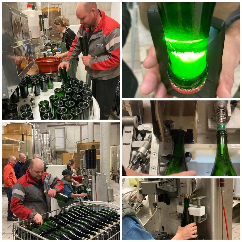 Our timing was perfect, as they were in the process of degorging (dégorgement), which is where they freeze the dead yeasts, that they have spent weeks slowly collecting into the neck of the bottle, and then release them by popping the little plastic cap off. They then add the dosage (liqueur d’exposition), before closing the bottle again with its proper cork and cage.